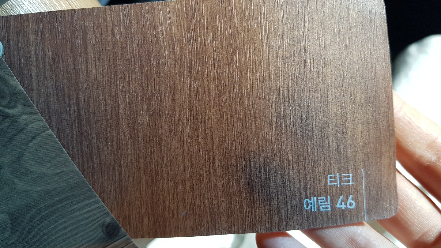 집 실내에 인테리어 필름 작업을 하는 곳은 창문틀과 벽면 매립 수납칸 그리고 거실과 주방사이 가벽이다. 가벽과 벽 수납칸 필름 색상은 싱크대와 조화를 위해서 조금 짙은 우드톤의 ‘예림 46 티크’를 선택했고 창문틀 필름지 색상은 화이트와 짙은 블루로 선택한다.
