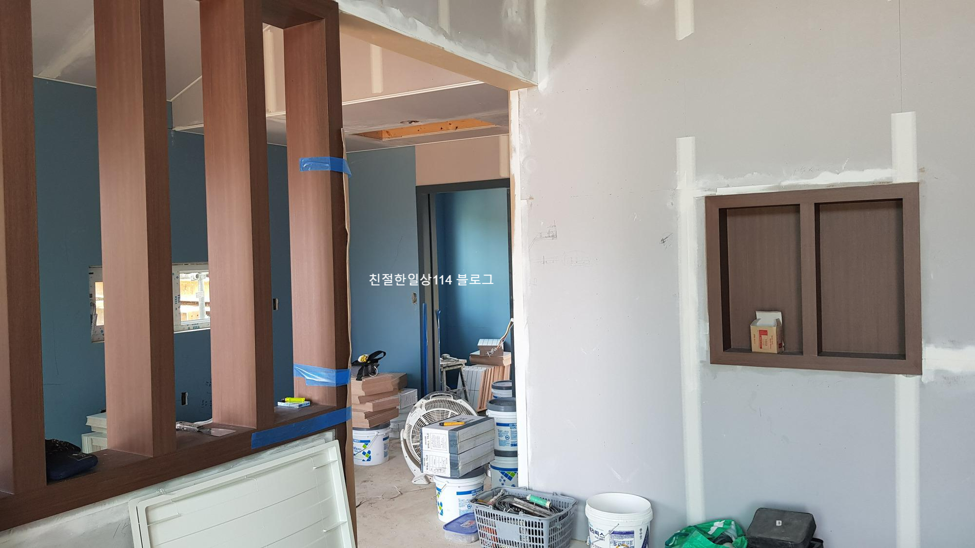 벽지와 주방벽 타일까지 시공 완료된 사진이다. 흰색의 벽지와 타일이 공간을 넓게 보이는 효과를 주고 거기에 짙은 색의 가벽과 벽수납칸이 선을 그어줌으로써 무게감을 주면서 포인트 역할을 하고 있다.