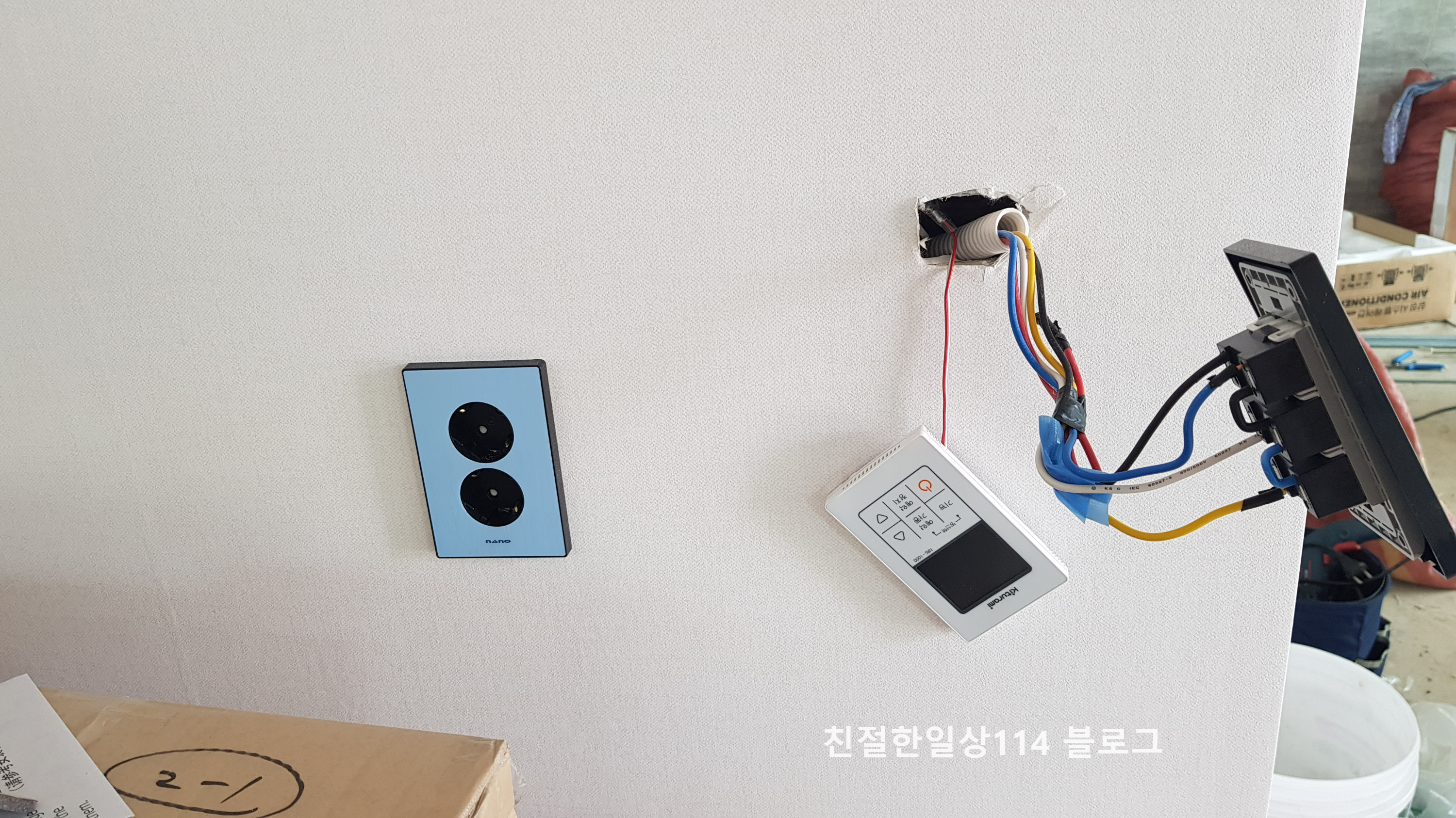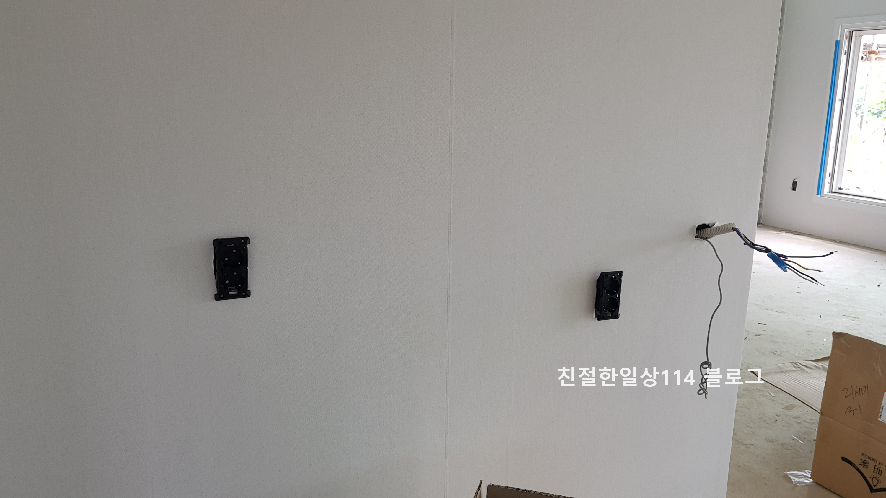 콘센트와 스위치, 보일러 온도조절기가 설치될 자리에 커버를 달기전 모습.