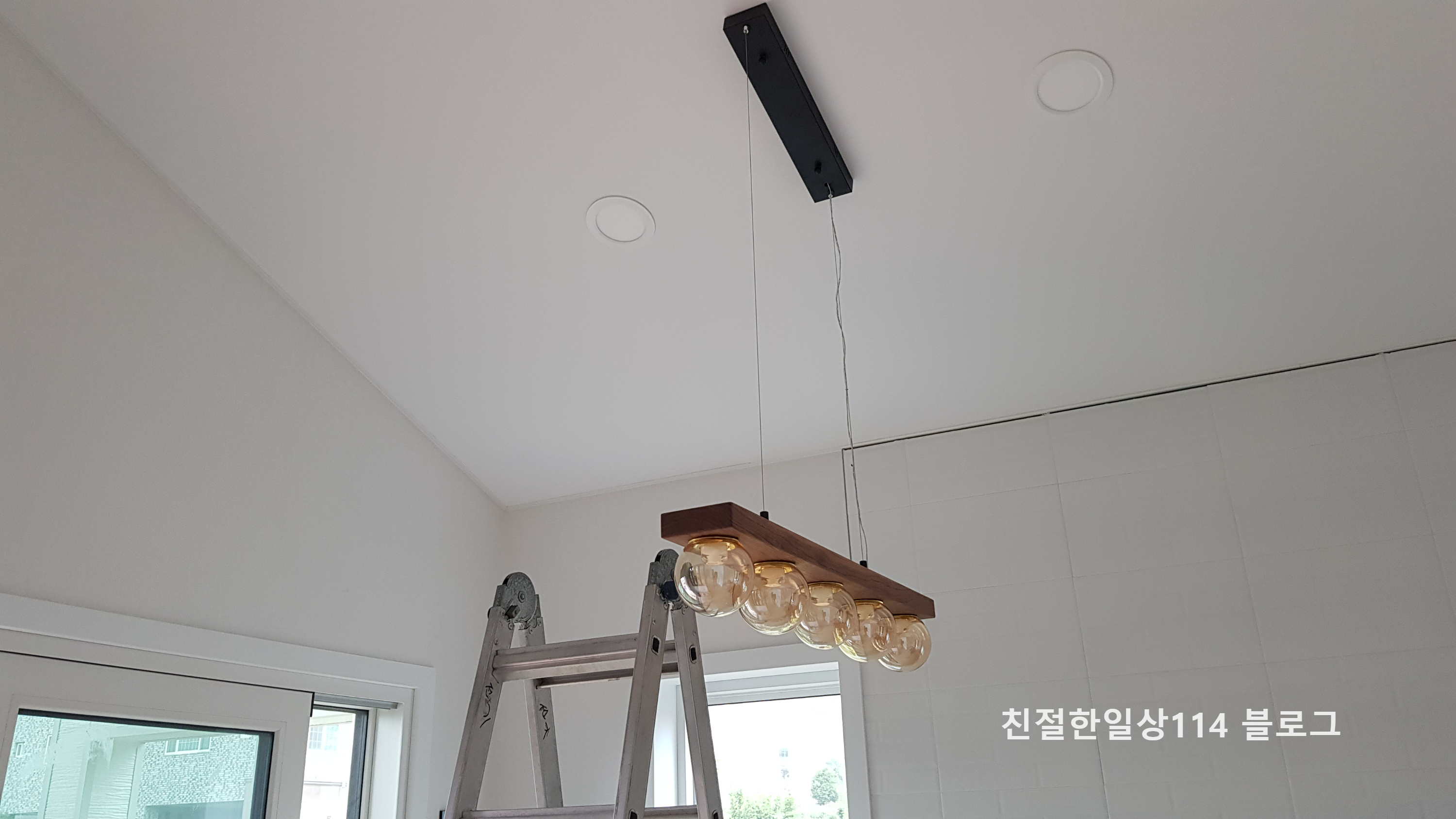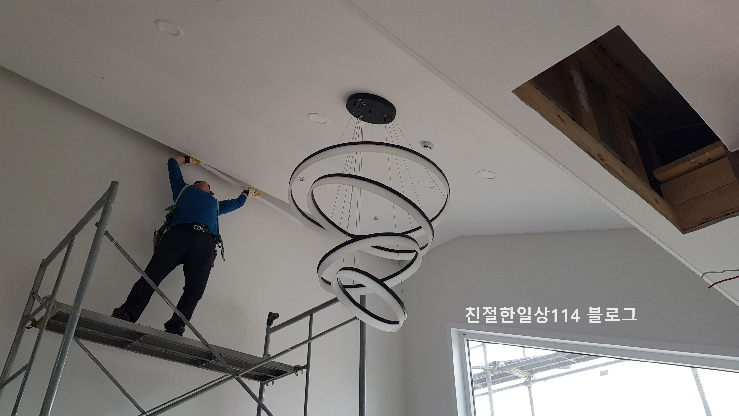 거실 메인등을 단다. 거실등 크기도 크고 천고가 높아서 두명이서 작업을 한다. 천장이 기울어진 모양이지만 설치하는데는 문제 없다.