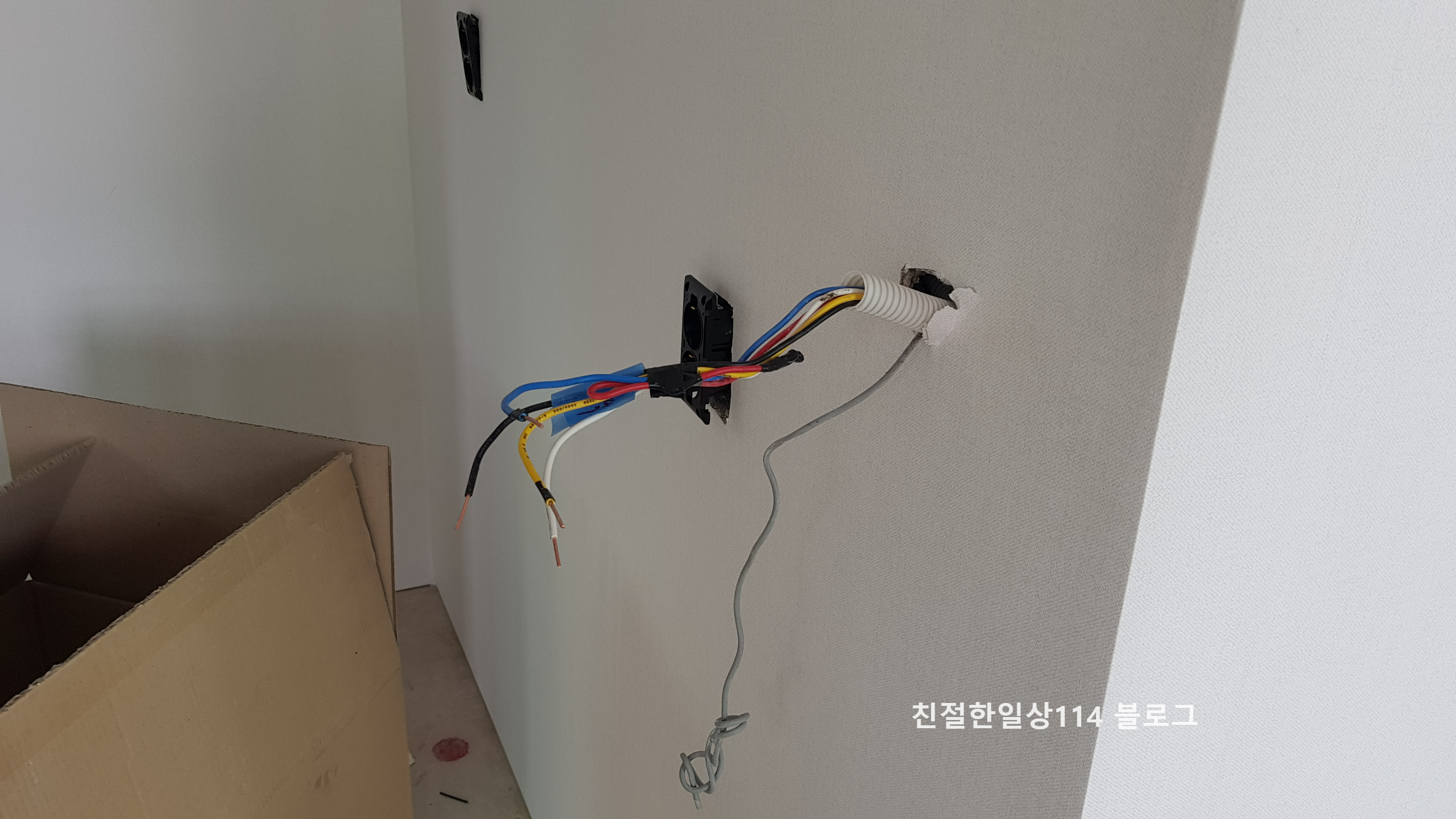 주방쪽 보일러 조절기와 스위치는 당분가 이렇게 튀어나온 상태로 둔다. 이곳에 광파오븐이 들어갈 키큰장을 짜넣고 키큰장 벽쪽에 구멍을 내서 달아낼 계획이다.