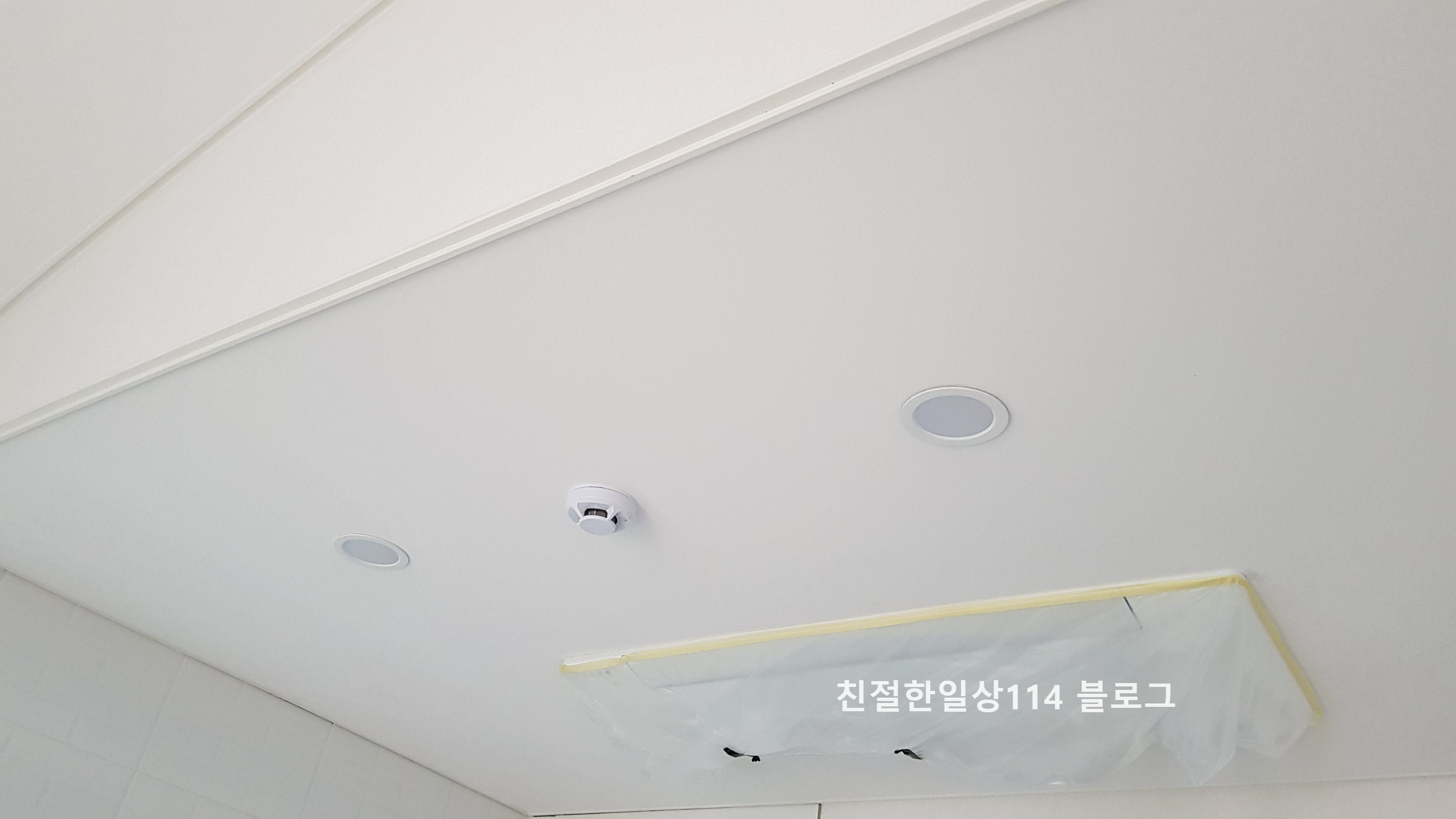 주방 천장에는 3인치 매입등이 설치 되었다. 가운데 튀어나와 있는건 화재 경보기로 각 공간마다 의무적으로 하나씩 달아여 한다.