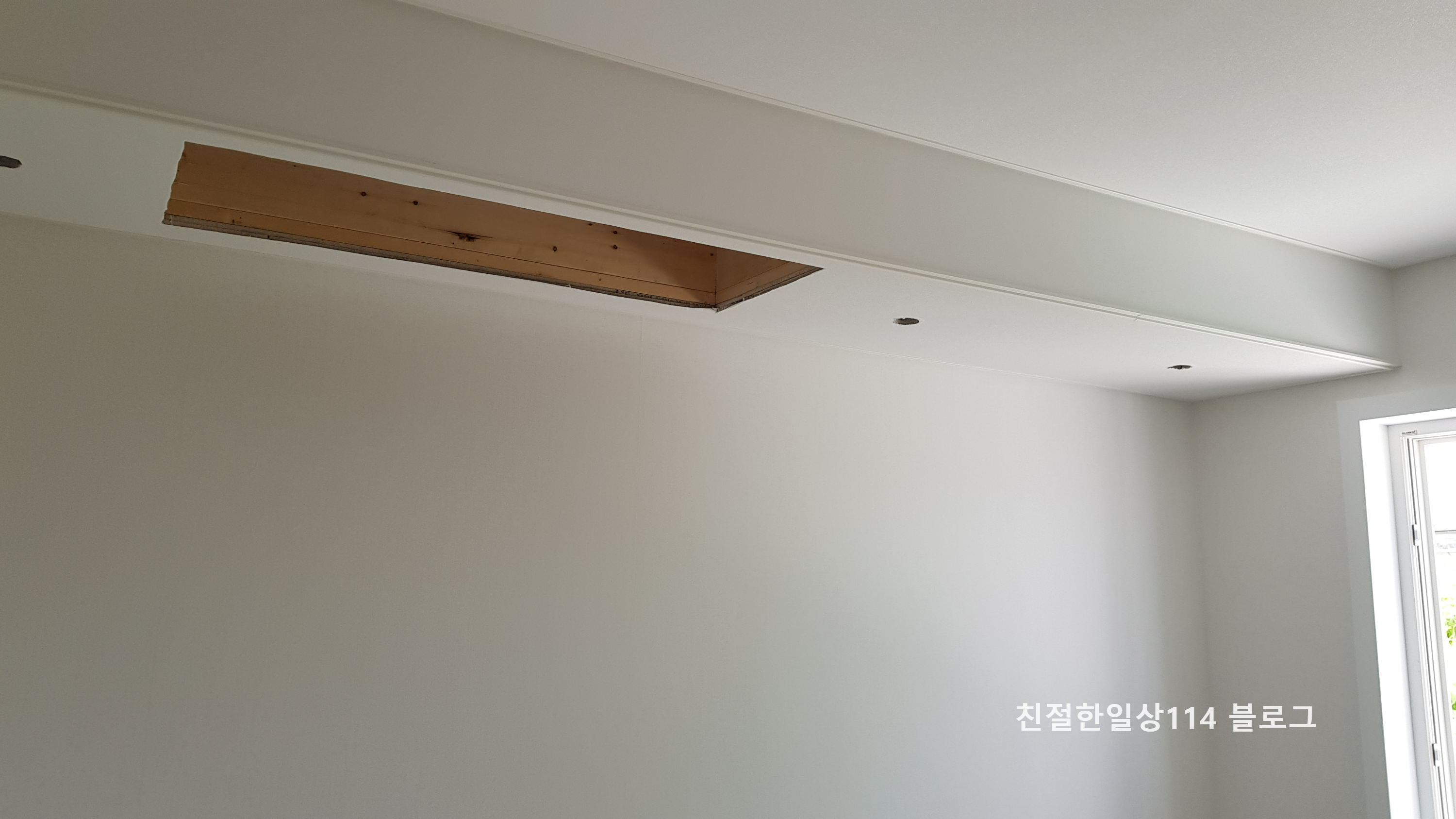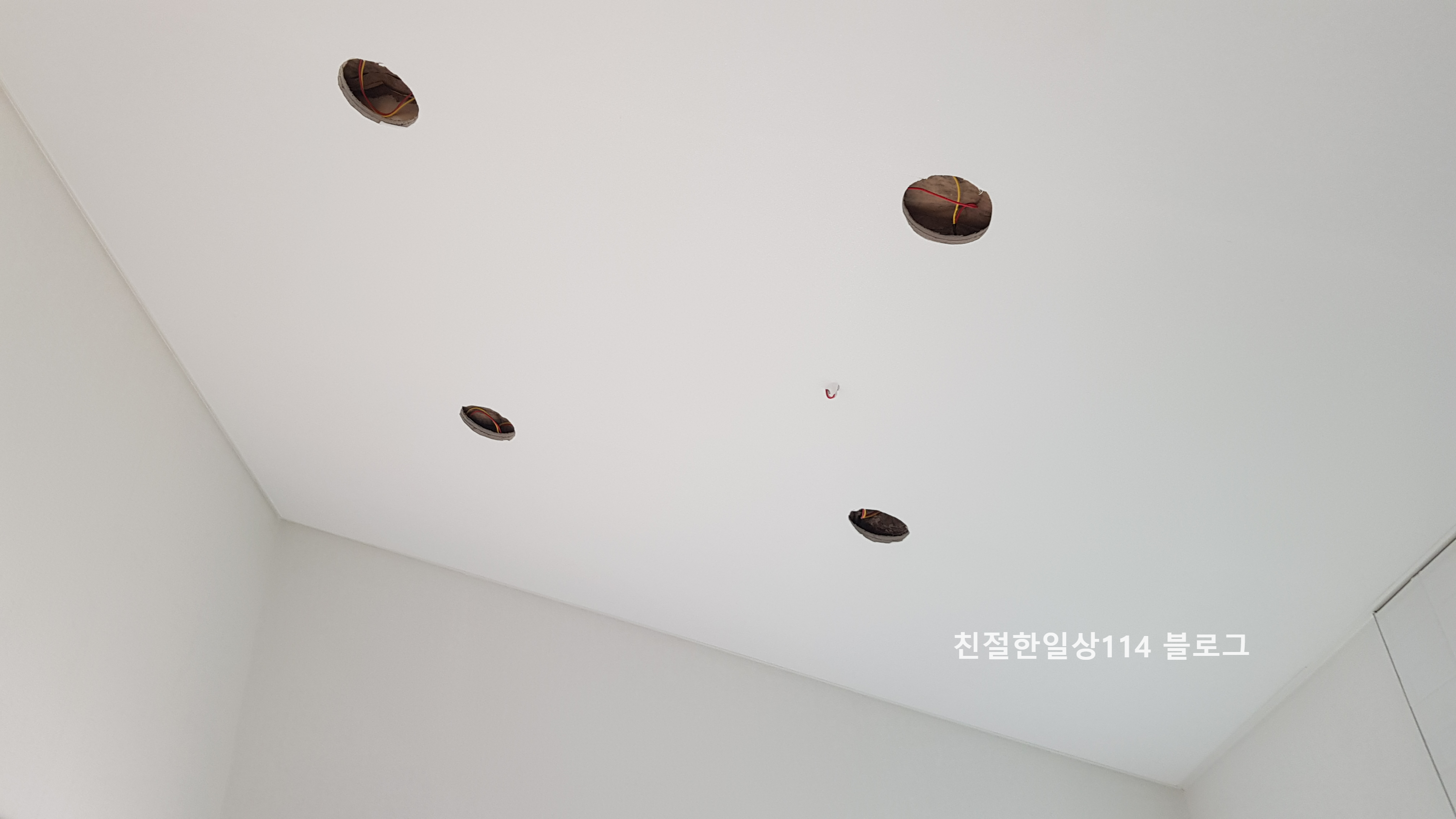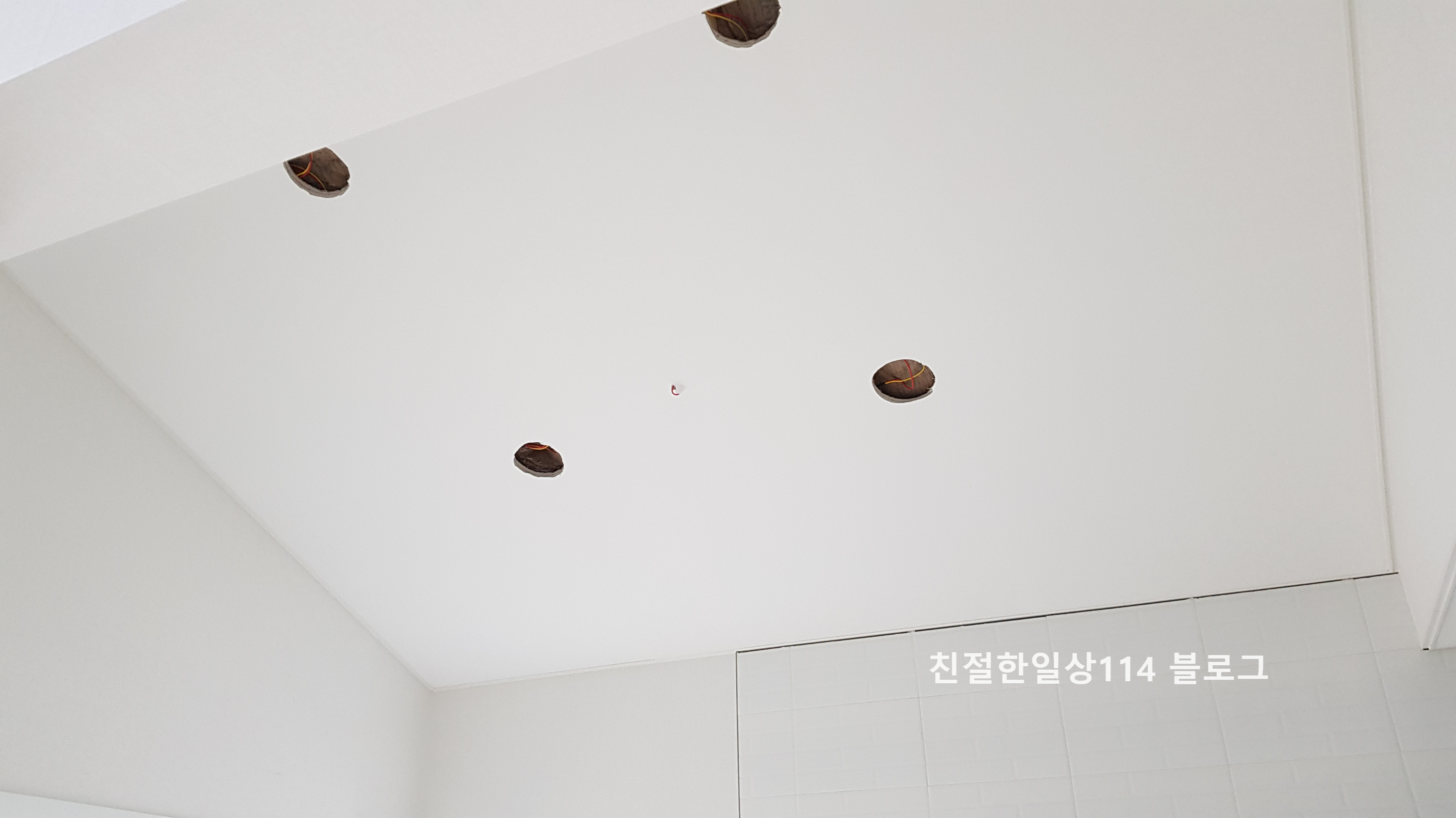 천장에 난 동그란 구멍은 6인치 매입등 자리이며 가운데 튀어나온 전선은 주방 펜던트를 연결할 선이다.