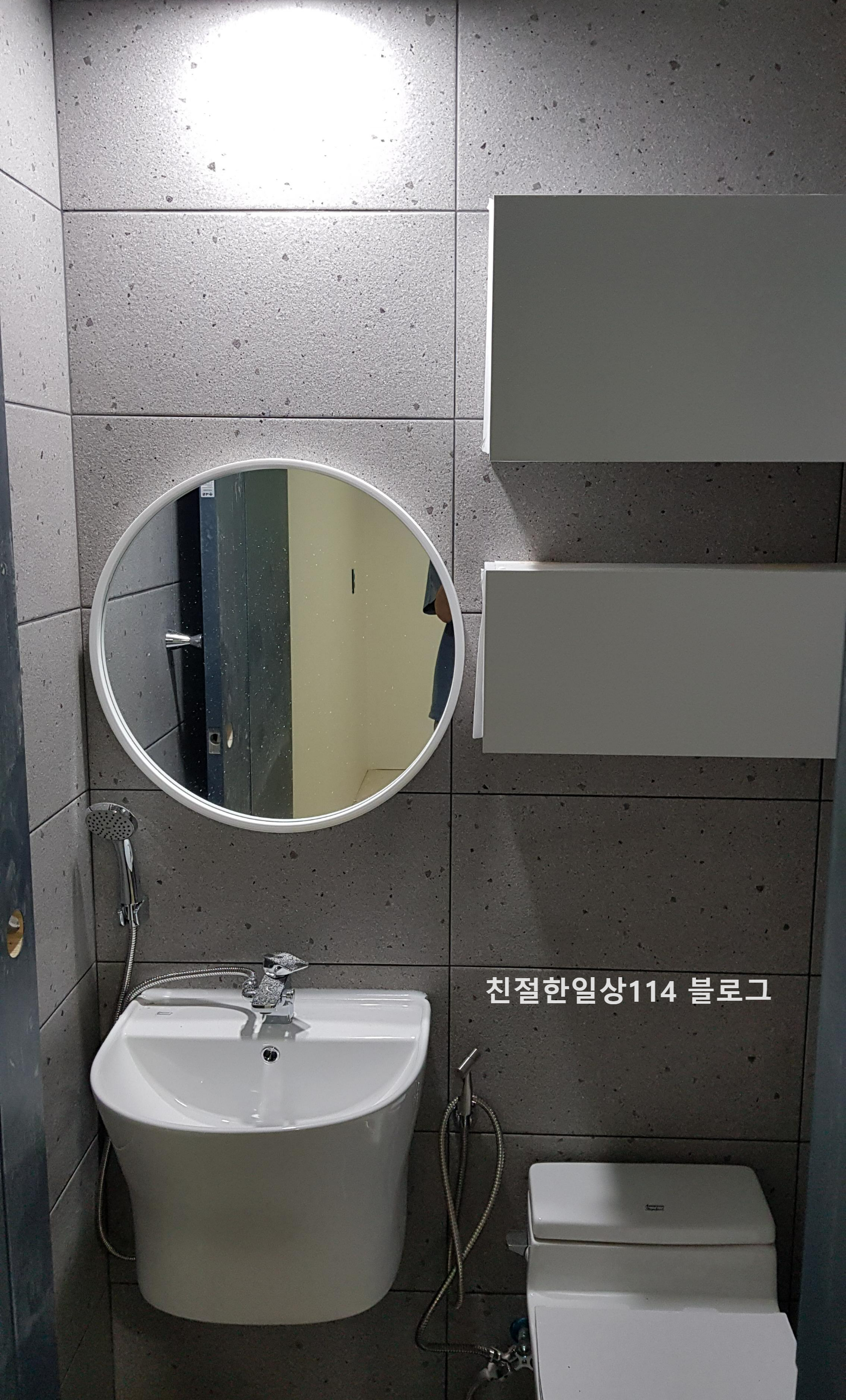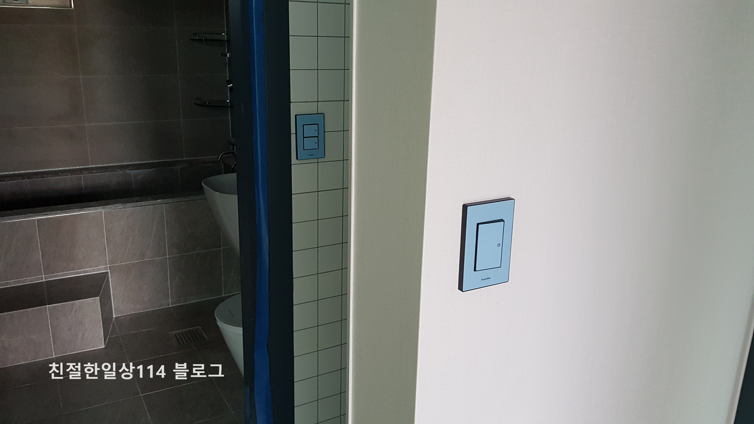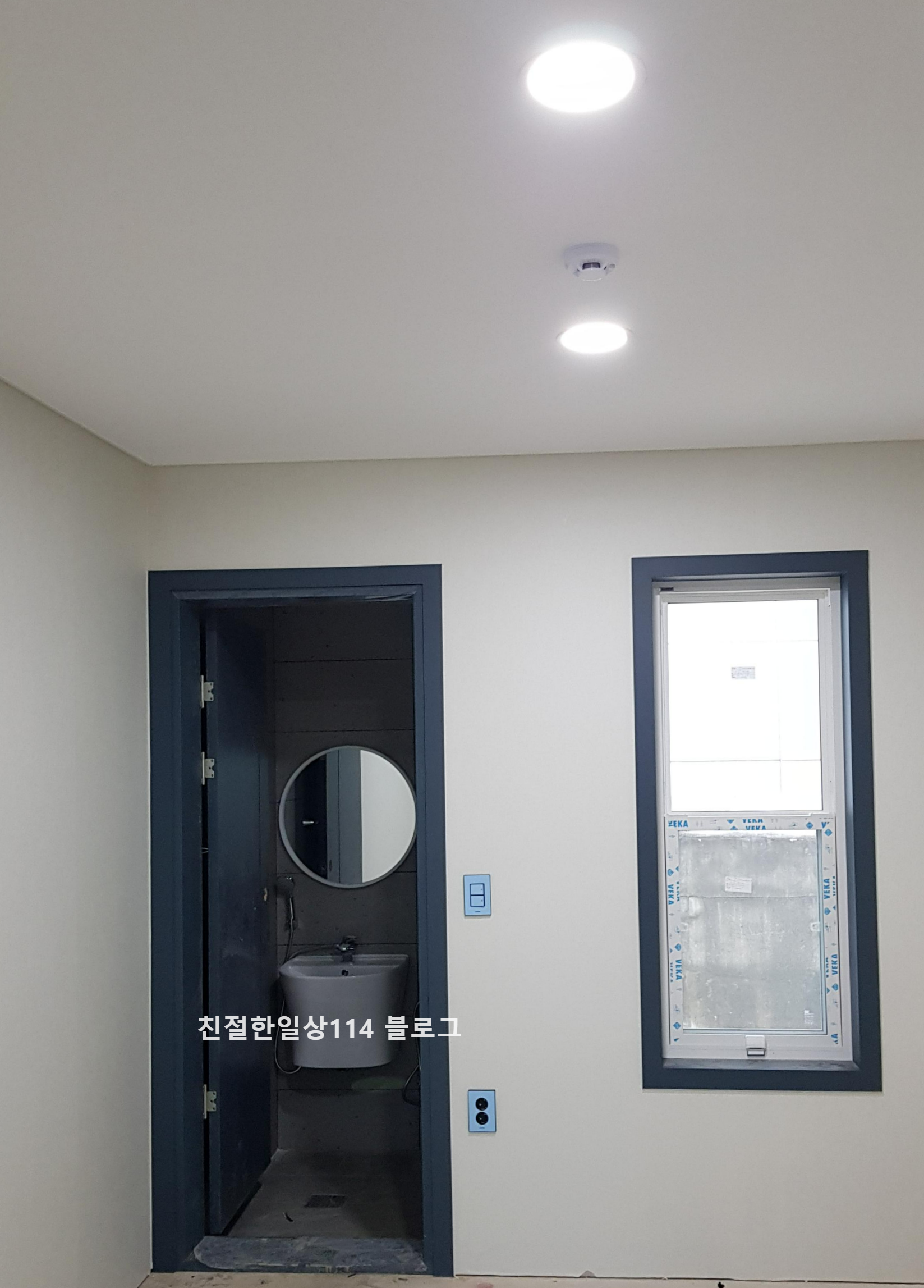 메인화장실과 현관 사이에 있는 건식 세면공간이다. 왼쪽으로는 화장실 스위치 선이 빠져나와 있고 오른쪽으로는 콘센트 선이 나와있다.