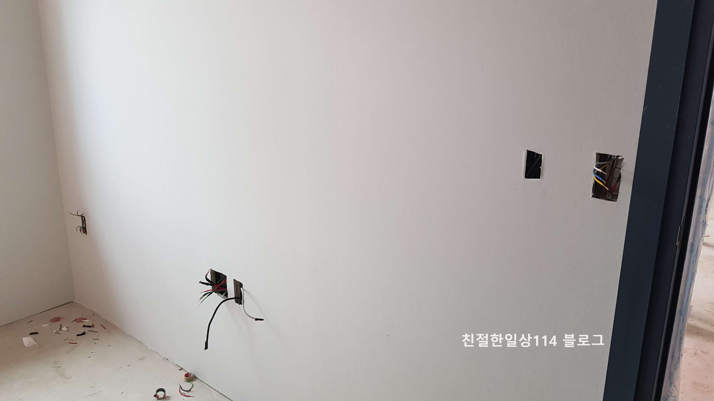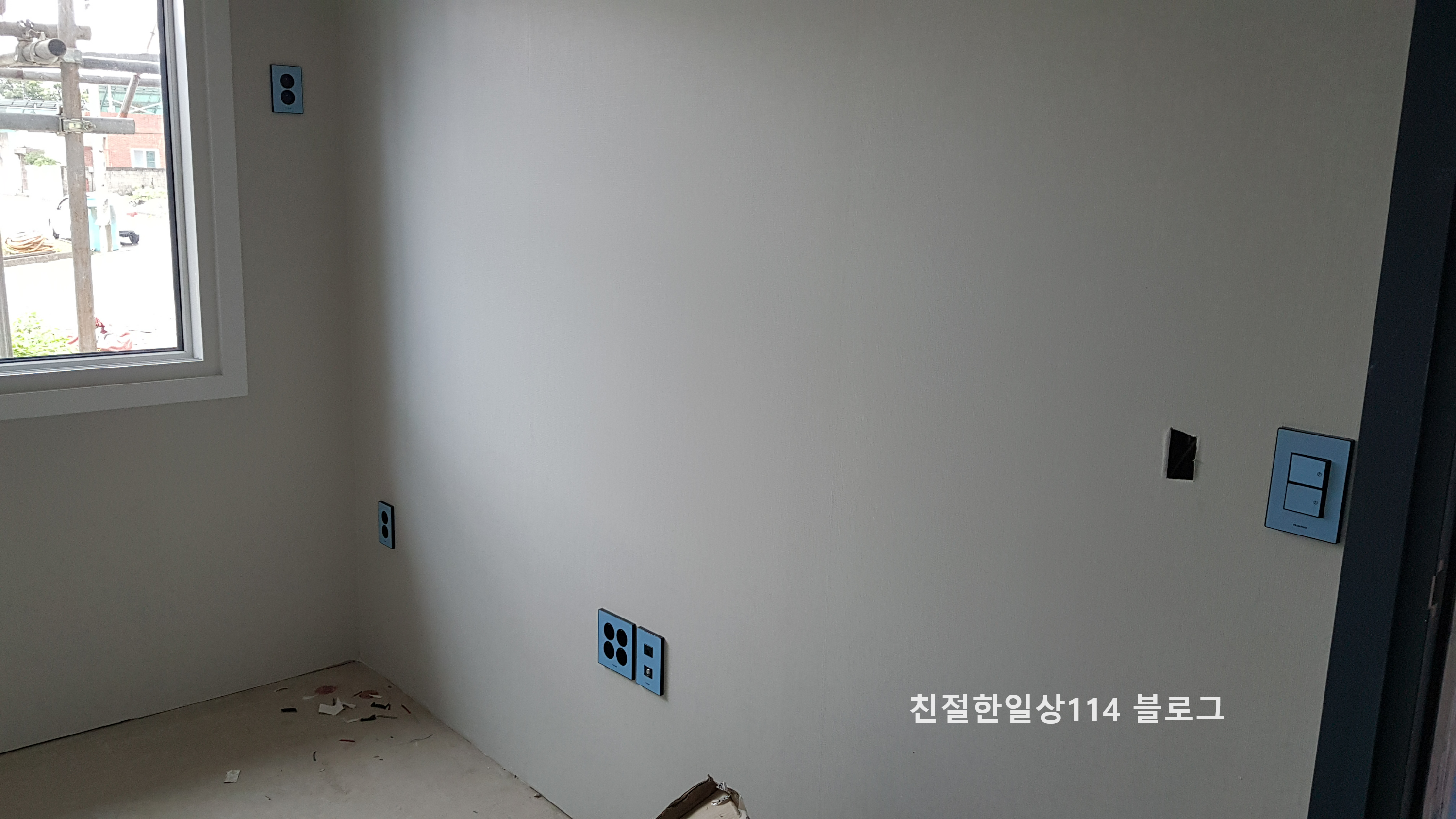 콘센트와 스위치, 보일러 온도조절기가 설치될 자리에 커버를 달기전 모습.