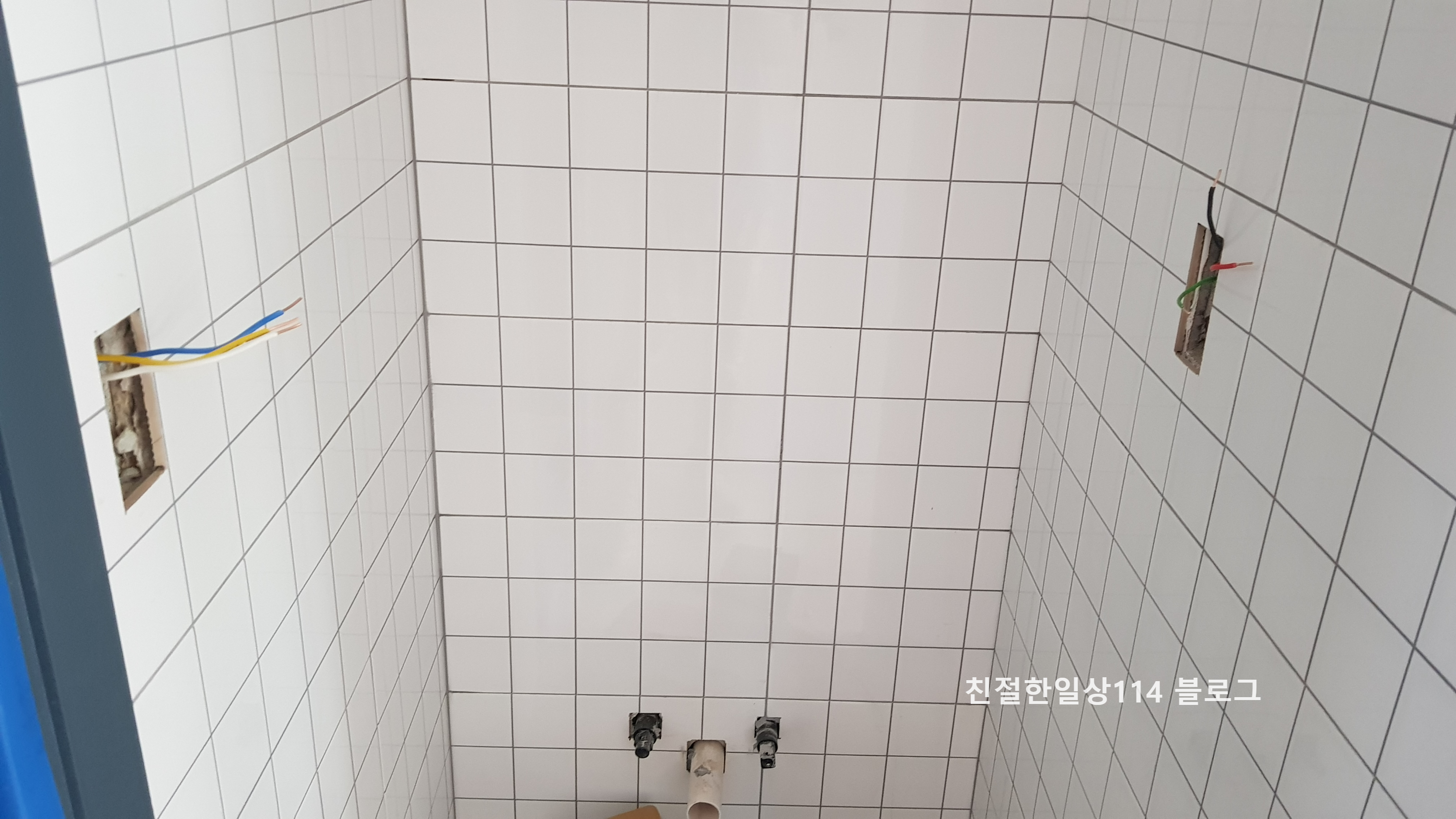 주방쪽 보일러 조절기와 스위치는 당분가 이렇게 튀어나온 상태로 둔다. 이곳에 광파오븐이 들어갈 키큰장을 짜넣고 키큰장 벽쪽에 구멍을 내서 달아낼 계획이다.