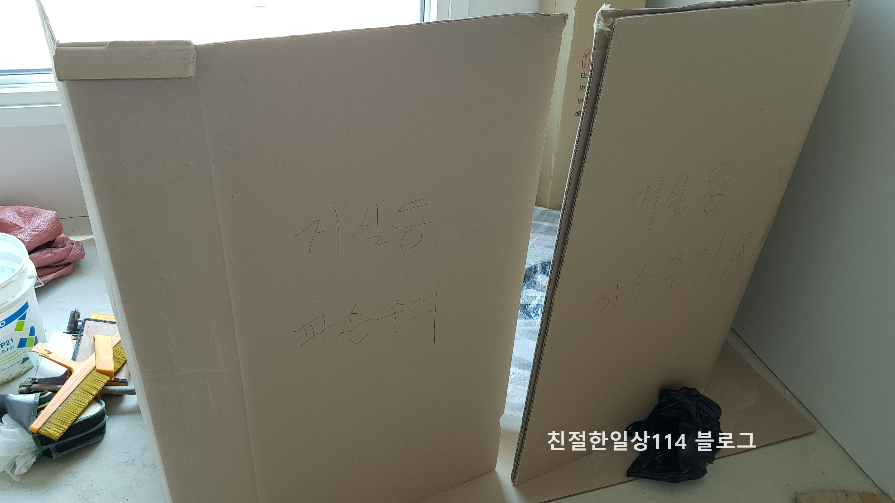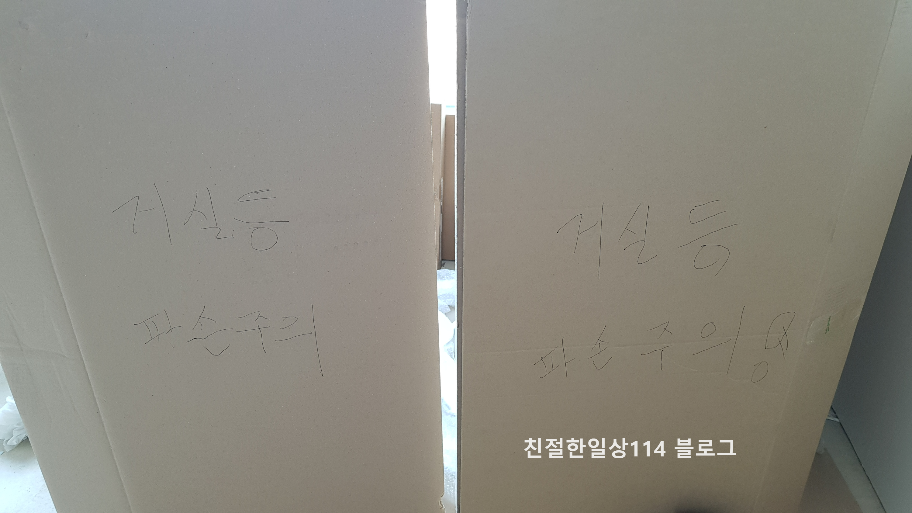 발품팔아가며 어렵게 구한 조명이기에 혹시 파손될까 주의 표시판을 만들어 세워두었다. 자 이제 조명이 준비 되었으니 설치에 들어간다.