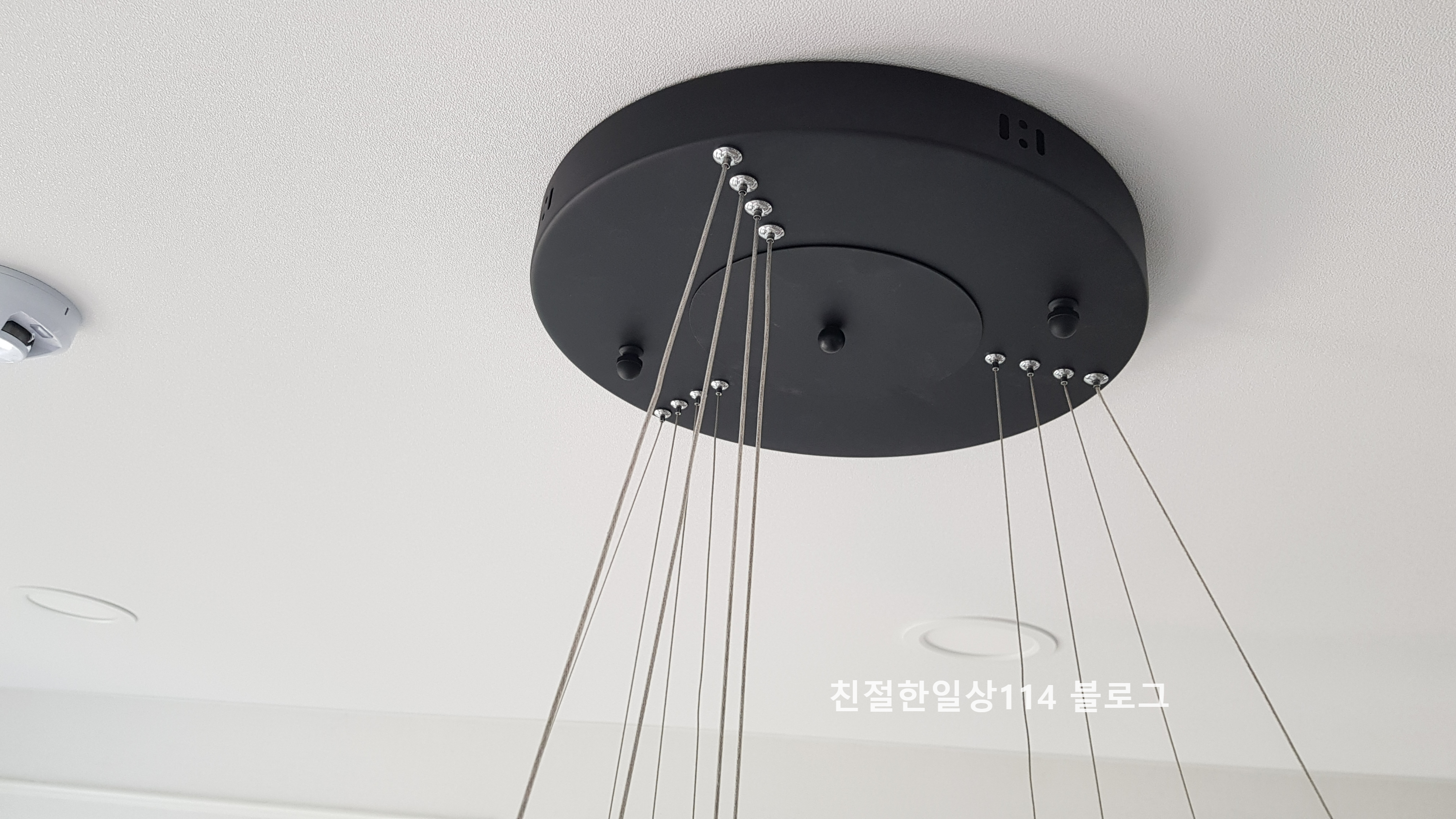 거실 메인등 설치 후 높이를 조율하고 있다. 거실등은 4단으로 되어 있어 각 단의 높이를 줄로 조절하여 다양한 연출이 가능하다.