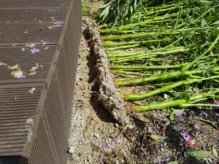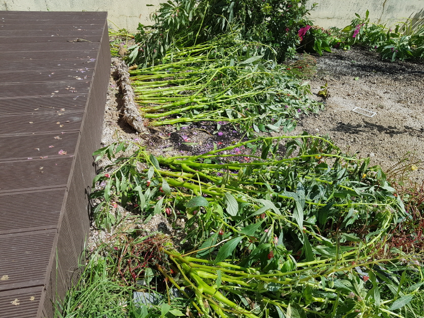화단의 봉선화는 강풍으로 인해 뿌리채 쓰러졌다. 봉선화 뿐만 아니라 천사꽃과 백일홍도 심하게 기울어져 복구를 진행했다.