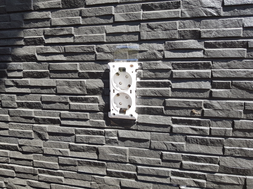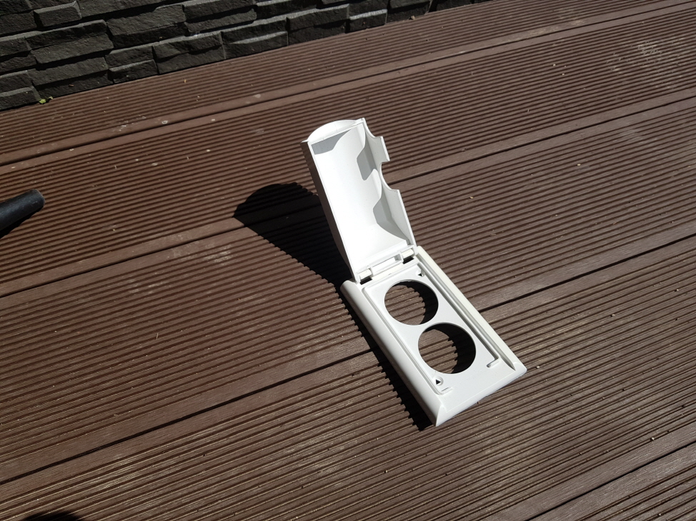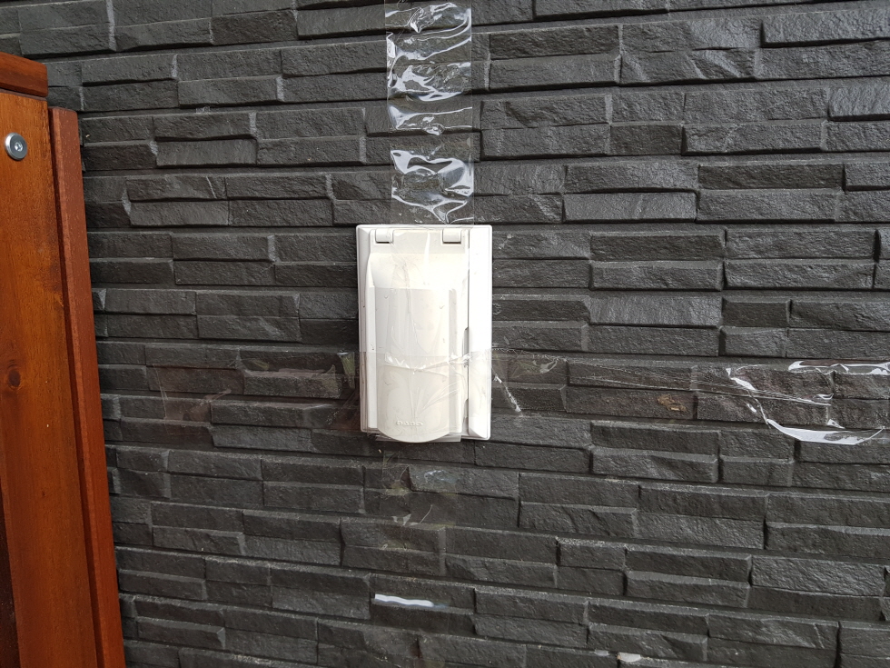 태풍이 잠잠해지고 마당에 나가니 콘센트 덥개가 있었고 다시 제자리에 끼워 넣는다.