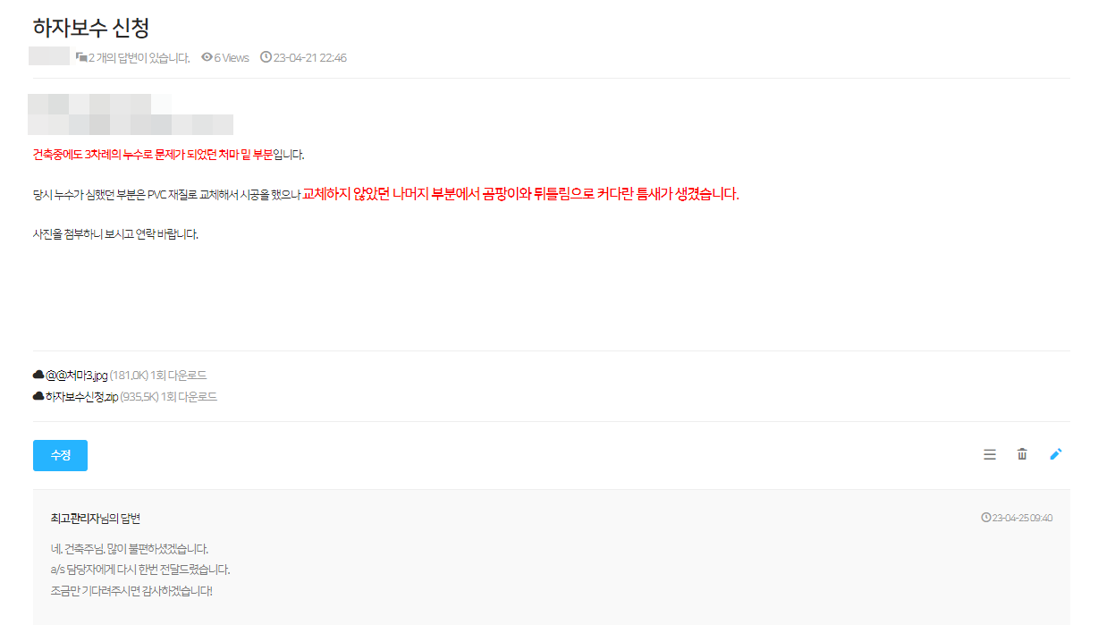 사무실에서는 하자접수는 홈페이지에서 신청을 하고 사진과 함께 올려 달라고 한다.