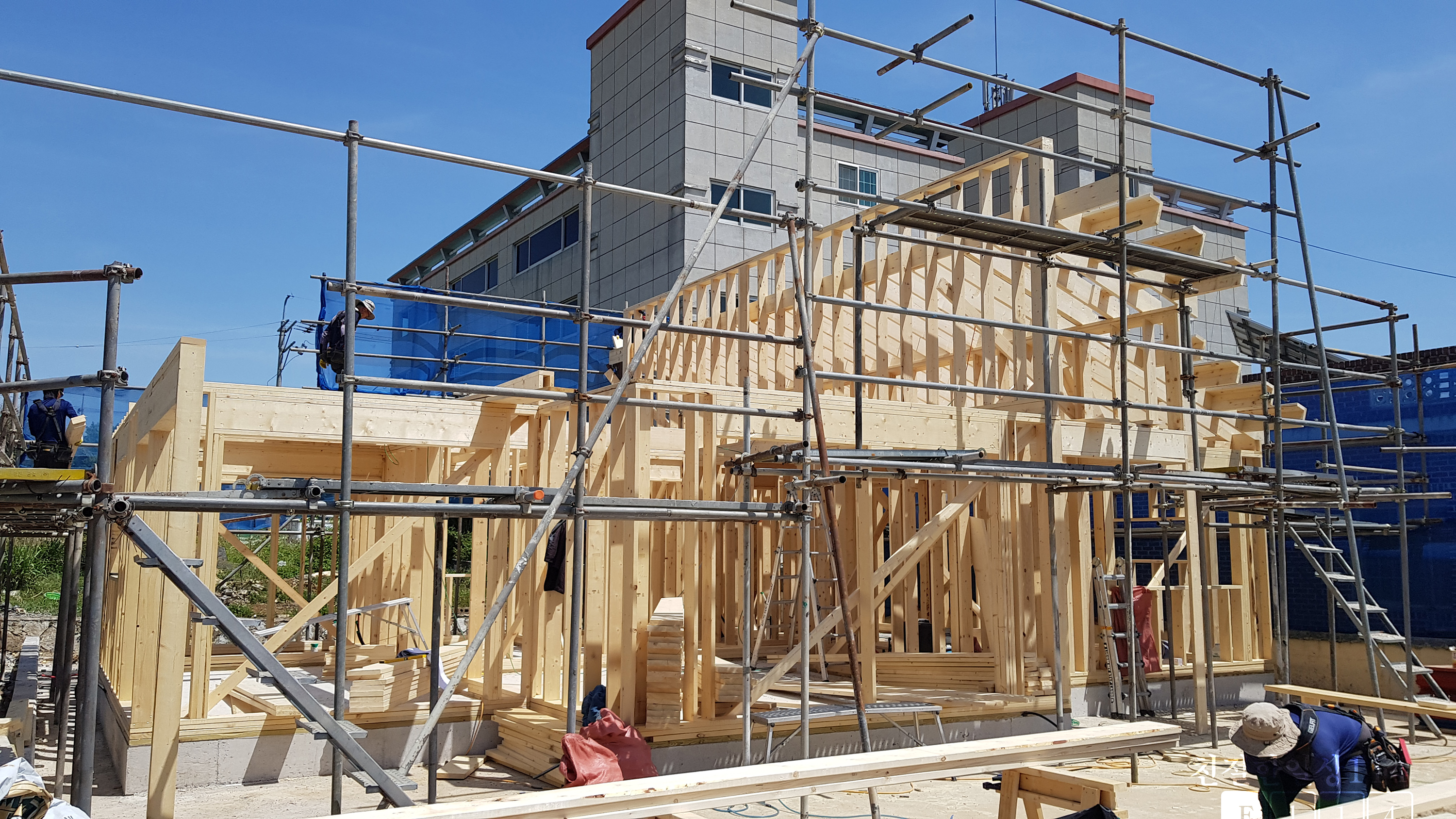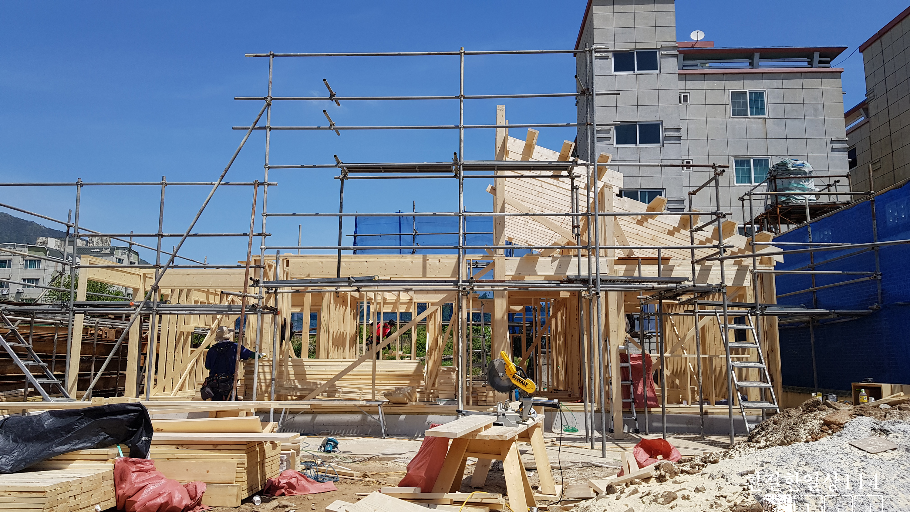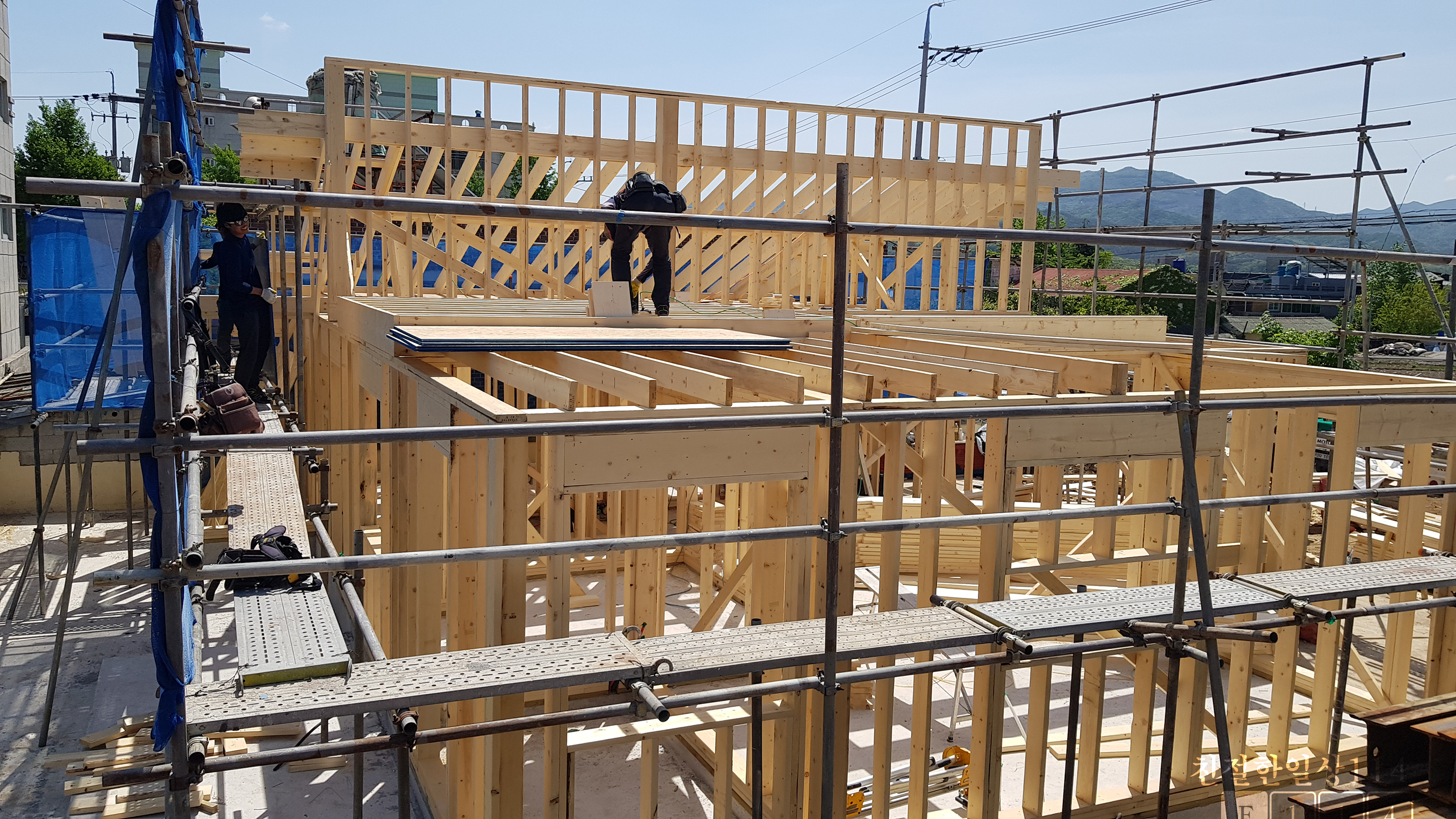 골조공사가 한창 진행중이다. 골조공사는 10일정도 소요될 것으로 예상되며 지붕을 덮기 전에 비가오면 골조가 젖을 수 있어서 날씨가 허락하는 한 쉬지 않고 공정을 진행한다. 목재로 기둥이 세워지고 창문과 문 틀이 만들어지는 과정을 보니 신기하고 재밌으면서도 하루하루 달라지는 모습에 가슴이 뛴다. 그동안 머릿속으로 상상하고 도면으로 봐왔던 집이 실제로 눈앞에 실체를 드러내고 있다. 다행히 날씨가 계속해서 좋다. 골조공사가 중간쯤 되었을 때 다락과 지붕공사를 안전하게 작업할 수 있도록 비계를 설치해야 한다. 비계는 비계를 설치하는 전문업체에서 대여와 설치를 해준다. 그런데 문제가 생겼다. 집 사방의 둘레로 비계를 설치해야하는데 집의 전면과 후면은 설치할 공간이 충분했지만 양 옆으로는 설치할 공간이 안나온다는 것이다. 다행히 시공사에서 제시한 해법과 이웃집의 양해로 풀어나갈 수 있었다. 이렇게 풀어나간 비계 설치에 관한 이야기를 사진과 함께 남겨본다.