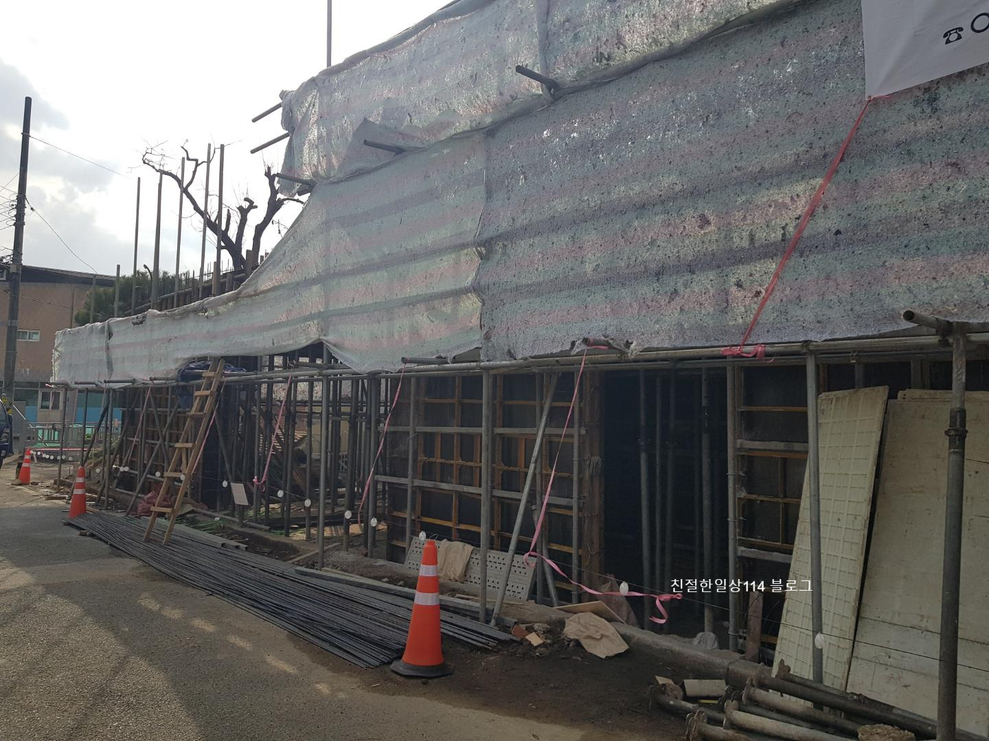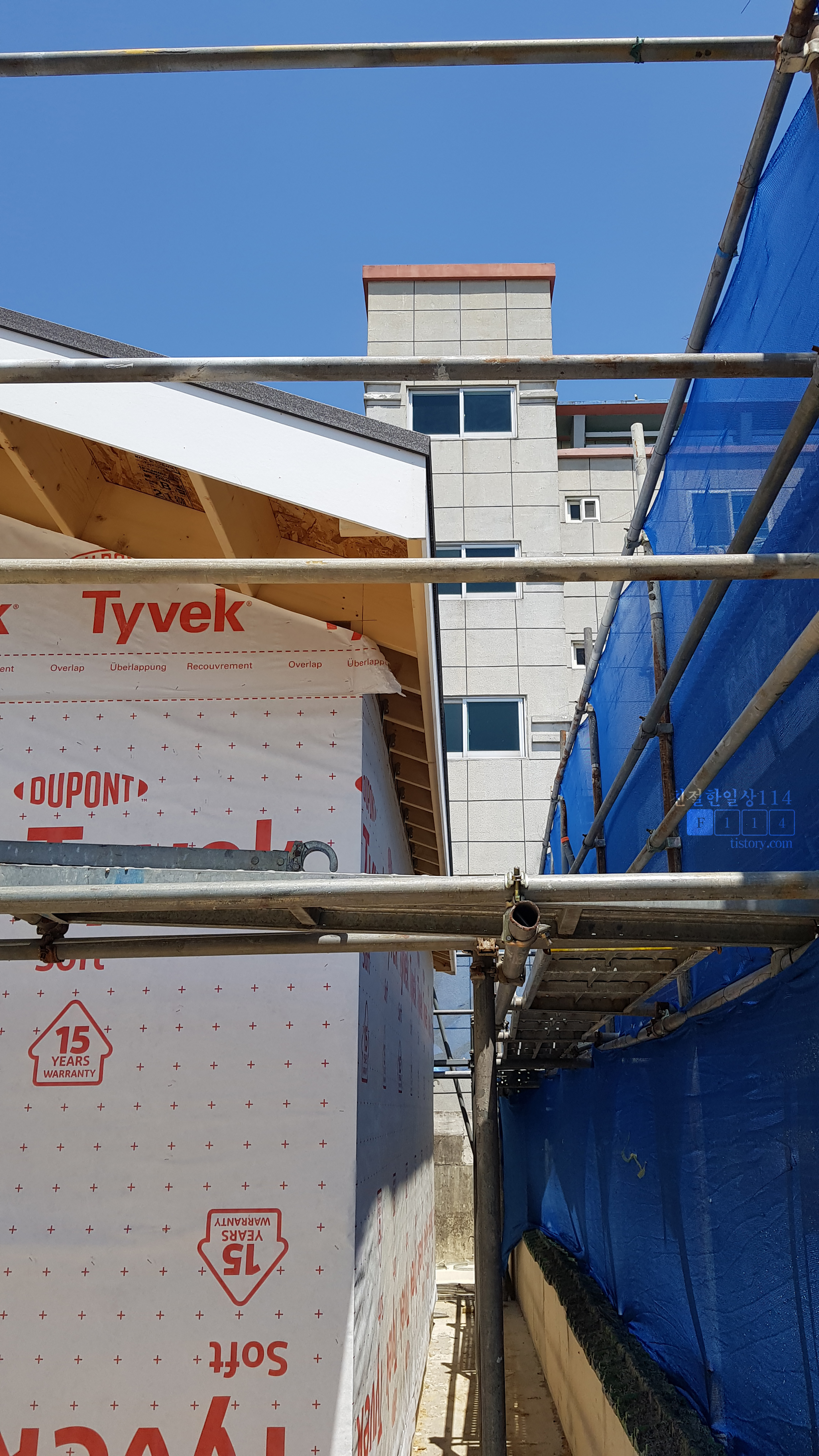 이렇게 양해를 구하고서 비계설치업체에서 설치날 현장을 보고서는 우리땅 안으로는 설치가 안되어 이웃집 땅으로 넘겨 설치를 해야하는 것으로 진행했다. 사전에 설치공간을 확인하고 양해를 구해뒀기 때문에 신속하게 결정하고 설치할 수 있었다.