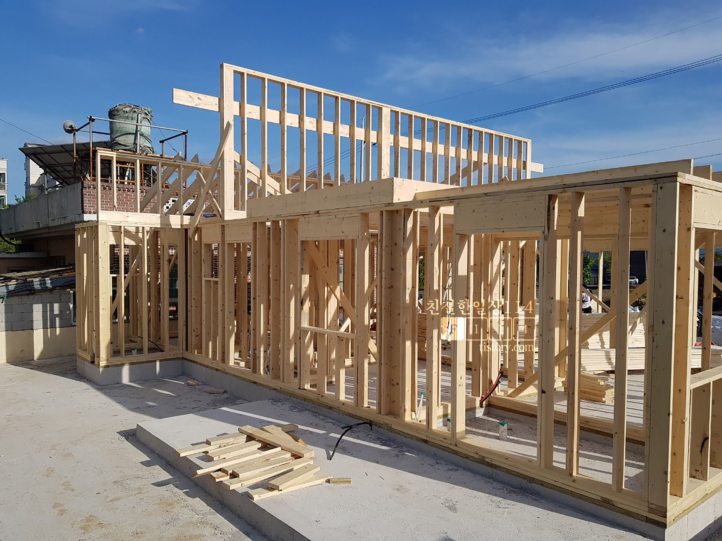 1층 골조공사가 끝나고 2층 다락과 지붕을 올리기전에 비계를 설치해야한다. 골조공사 진행 정도에 따라서 비계설치 일정을 잡아야 골조공사가 지연되지 않는다.
