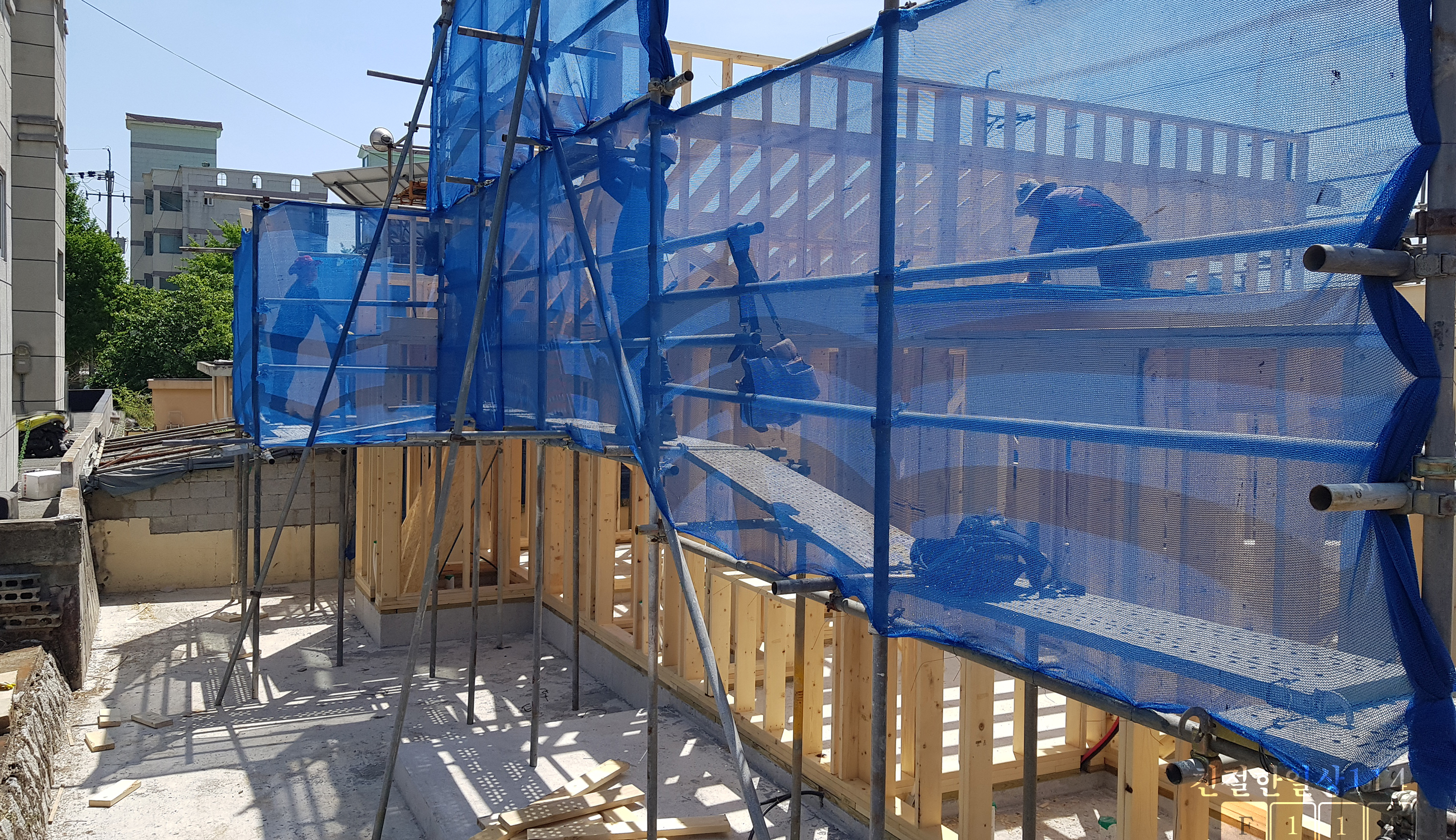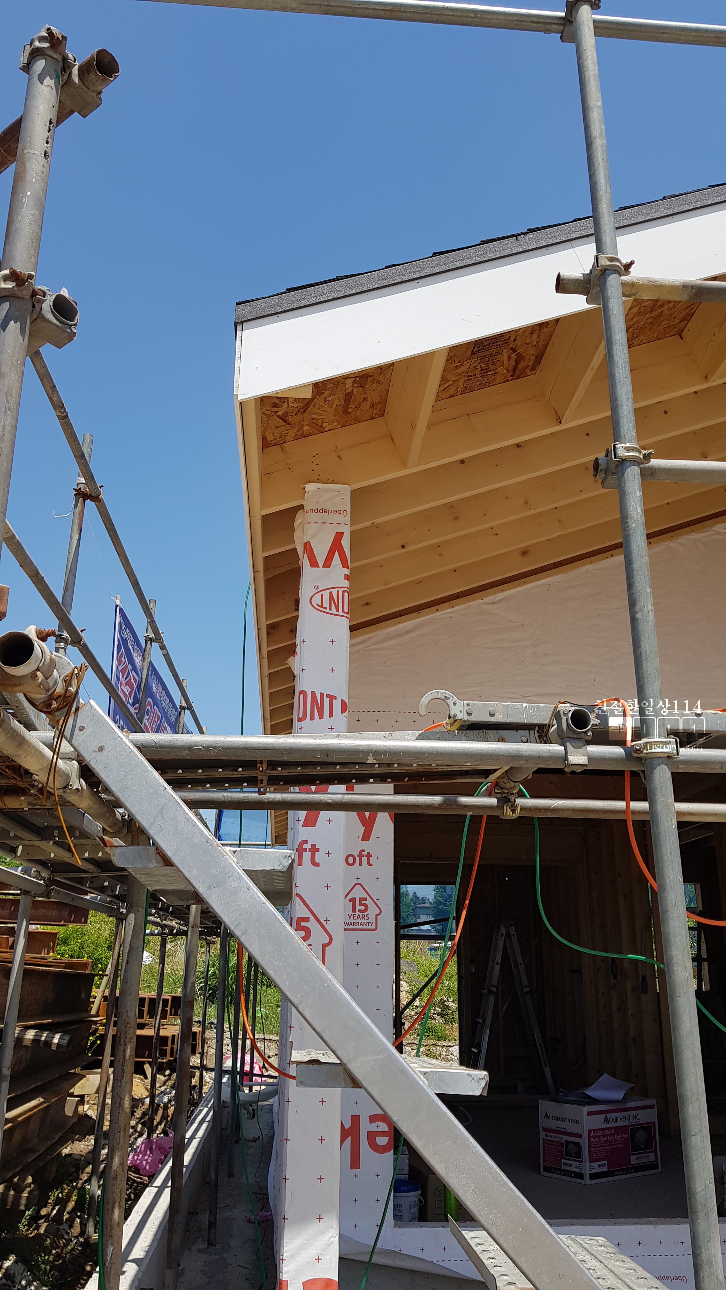 이렇게 비계를 설치하고나서 다락과 지붕공사 그리고 외벽공사까지 안전하게 진행할 수 있었다. 비계해체는 설치 후 약 40일 후로 예정되어있었는데 예상치 못 한 처마와 지붕 오시공 문제가 발견되어서 조금 더 연장되었다. 비계설치를 하는 이유는 앞서 설명한대로 높은 곳의 작업 편의성과 작업자의 안전을 위한 기능도 있지만 비계에 망이나 천을 덧씌움으로써 공사소음과 먼지로 인한 피해를 줄이는 기능도 있다. 이제 비계를 설치했으니 다락과 지붕 시공들어갈 준비가 되었다. 다음에는 계단과 지붕, 수도 난방설비 등 시공 일정에 따라서 포스팅을 이어나가보도록 하겠다.