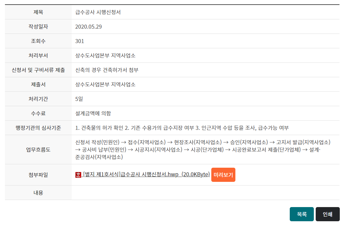 상수도 급수공사 시행 신청시 업무 순서는 다음과 같다