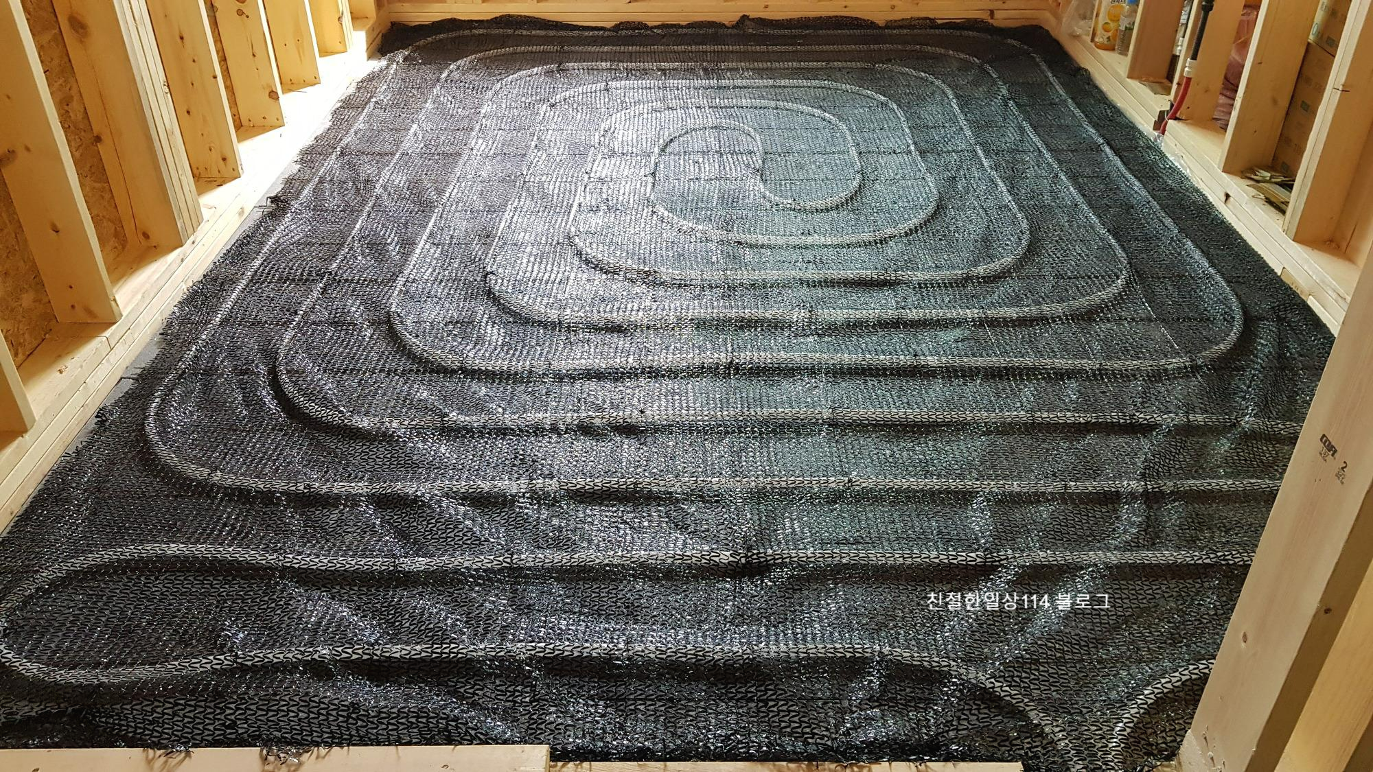 제일 먼저 바닥단열로 쓰이는 색깔이 있는 비드법 스티로폼을 깔고(5T) 그 위에 와이어매쉬를 깐다. 그리고 와이어매쉬 위에 난방배관(XL파이프)를 넓이게 맞게 깔고 고정핀으로 고정을 시킨 다음 차광막을 덮는 순서로 진행된다.