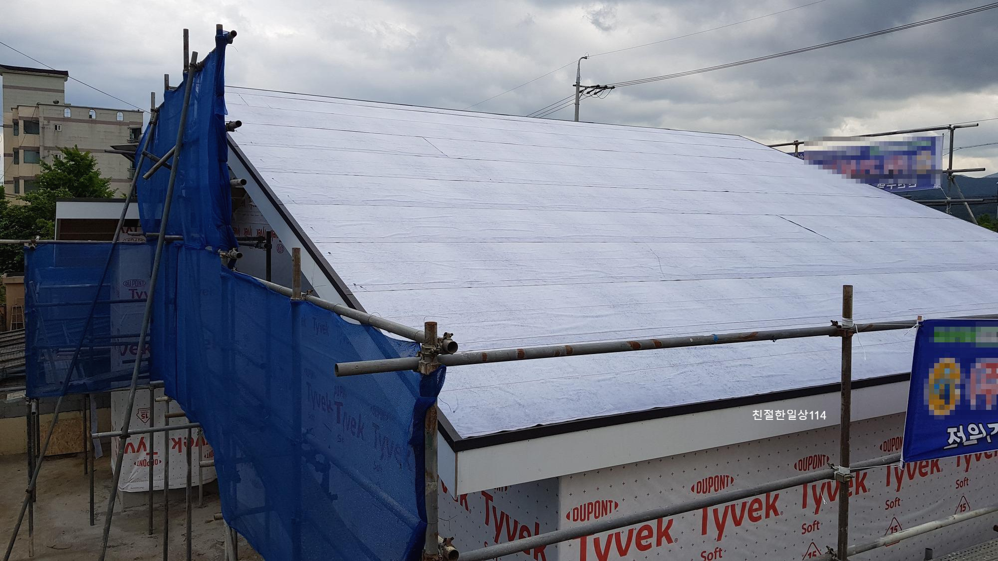지붕에는 방수시트를 덮어서 비가 오더라도 상관이 없다. 물 새는 곳이 없는지 테스트 해보려는지 하늘에 먹구름이 드리운다.
