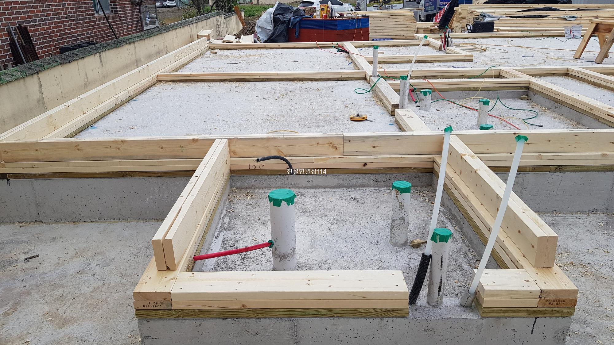 토대가 다 돼 갈때쯤 토대위에 벽체의 스터드와 창호, 문 등이 들어설 자리를 표시하게 된다.
