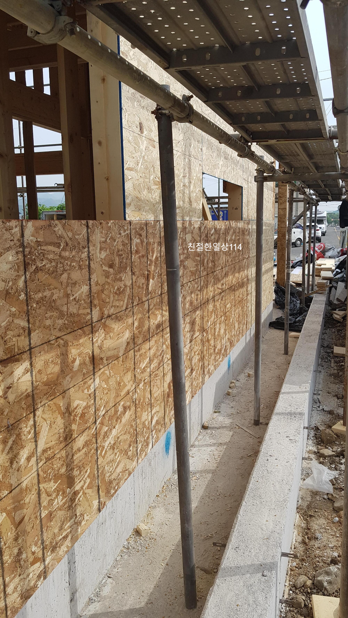 1층의 골조가 거의 끝나갈 무렵 외부 강관비계를 설치한다. 비계는 2층과 지붕 시공시 작업자의 안전을 위해서 비계 전문 업체에서 설치를 한다. 이때 동쪽으로 비계를 설치할 공간이 협소해서 미리 이웃집에 양해를 구하였다. 이웃집에 토지 매입때부터 인사를 드리고 시공에 앞서 공사일정과 기간을 설명드려서 인지 흔쾌히 이해해주었고 안전하게 비계를 설치할 수 있었다.