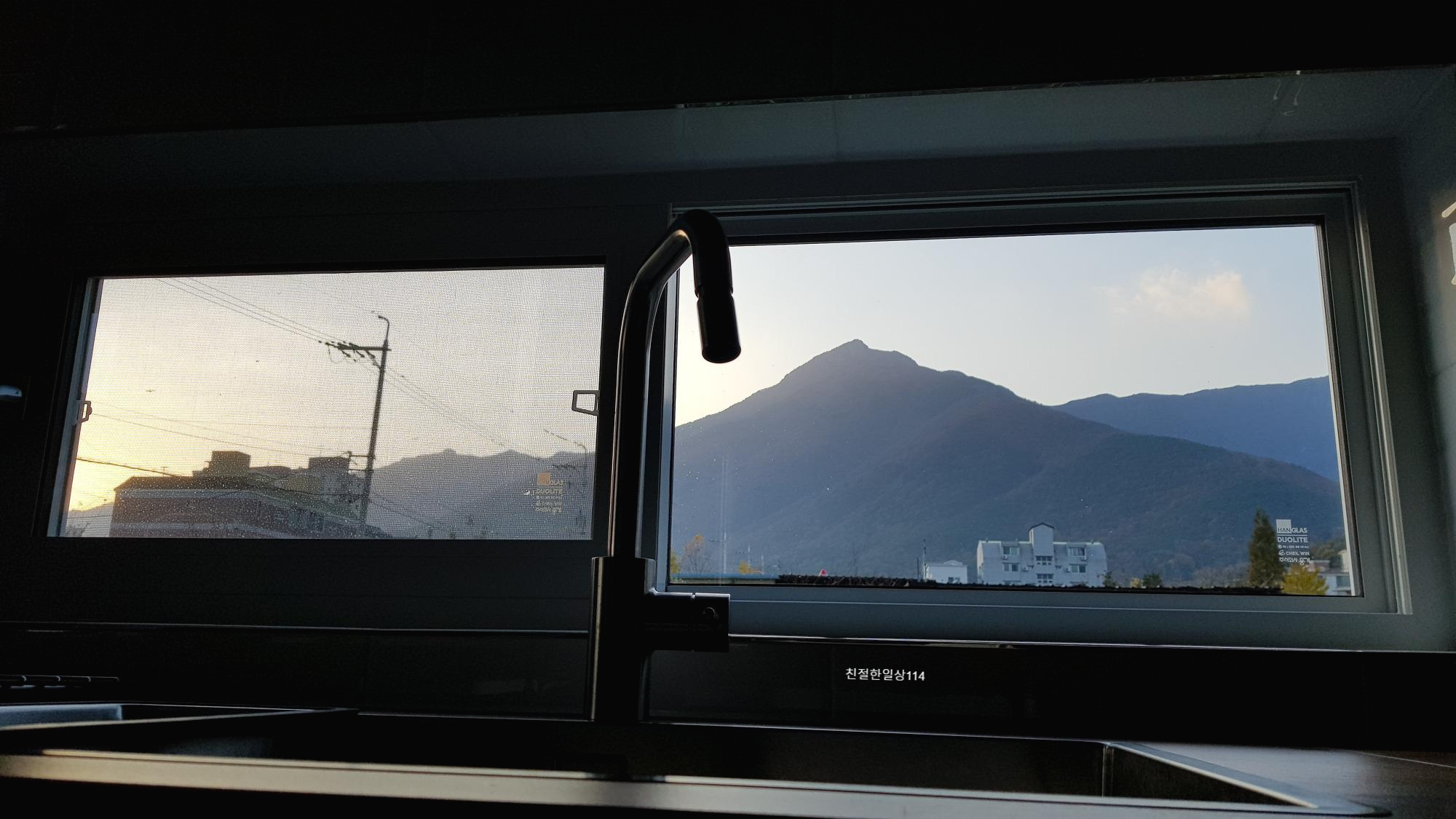 설계 당시 한번 얘기 했었는데 다락의 높이 문제가 터지는 바람에 창문 크기를 변경 문제를 확실히 매듭짓지 못 해서 반영이 되지 않았다. 돌이킬 수 없기에 아쉽지만 그대로 진행한다. -> 두고두고 후회가 되는 부분이다. 주방창이 서쪽인데 서쪽에 산이있어 풍경이 매우 멋지다.