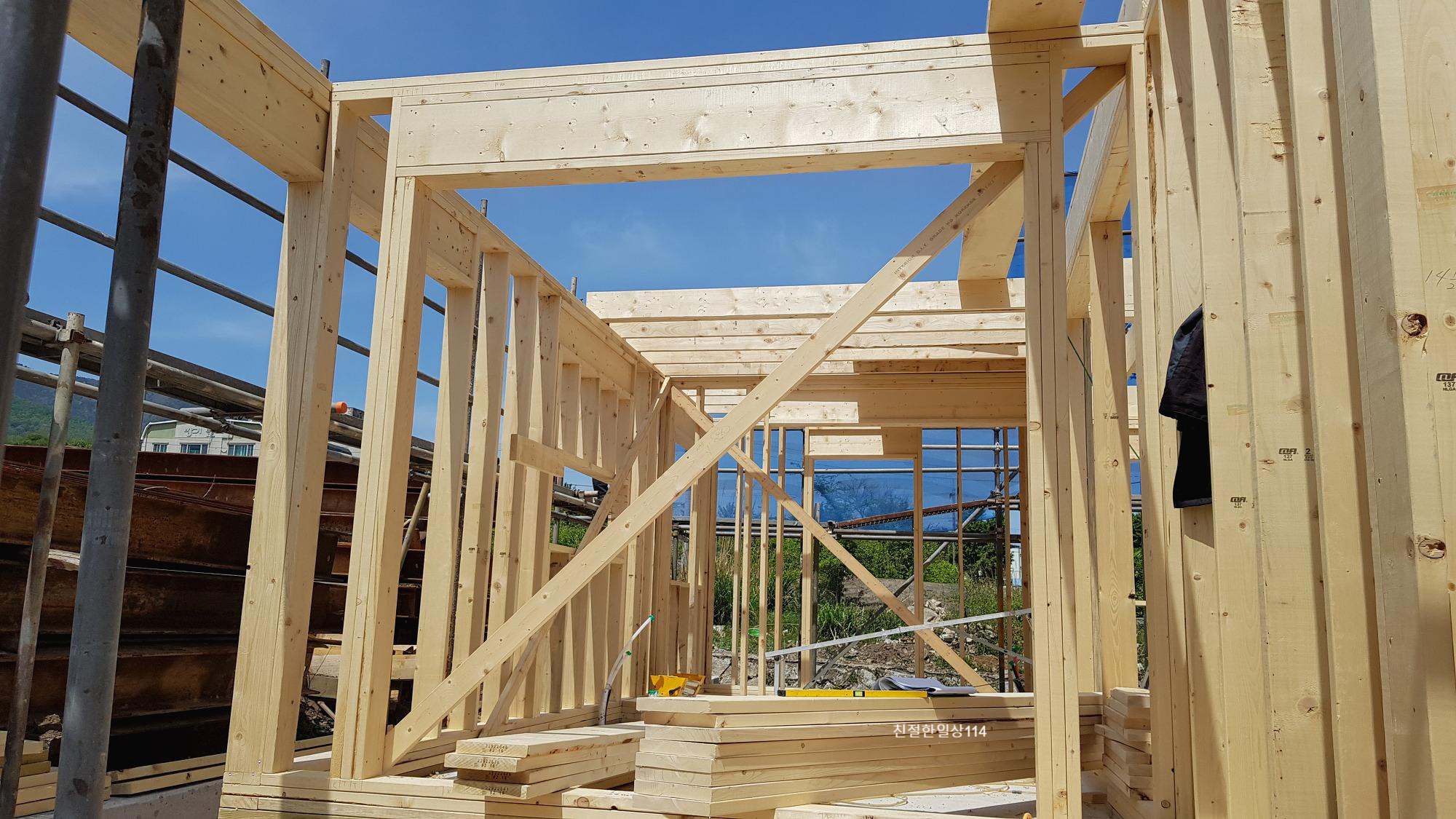 16일의 대장정?끝에 기초공사가 양생까지 모두 끝이 났다. 우려했던 날씨도 도움을 주어서 튼튼한 기초가 완성되었다. 이제 튼튼한 기초위에 집의 뼈대를 세우는 골조공사에 들어 갈 순서이다. 기초공사를 하면서도 일기예보를 하루 몇 번씩 봐 가며 하늘을 다독이는 마음으로 보냈었는데 이번 골조공사때도 마찬가지이다. 현재 짓고 있는 집은 경량목구조로 뼈대인 골조가 나무(목재)인데 나무는 물(습기)에 약하기에 비가 와서 젖으면 안되기 때문에 하늘을 다독이고 있는 것이다. 나무는 숨을 쉬기도 하고 물을 머금기도하고 내뱉기도 한다. 이렇게 얘기하니 마치 살아 있는 것 같다. 그래서 목조주택이 콘크리트주택보다는 자연친화적이며 건강에도 좋다고 하는가 보다. 목조주택과 물에 대한 이야기는 다음에 기회가 된다면 다뤄보기로 하고 이번에는 골조공사가 진행과정을 사진과 함께 남겨보도록 하겠다.