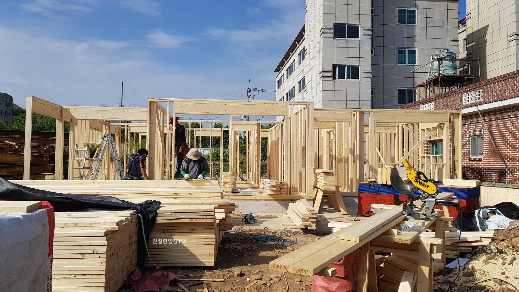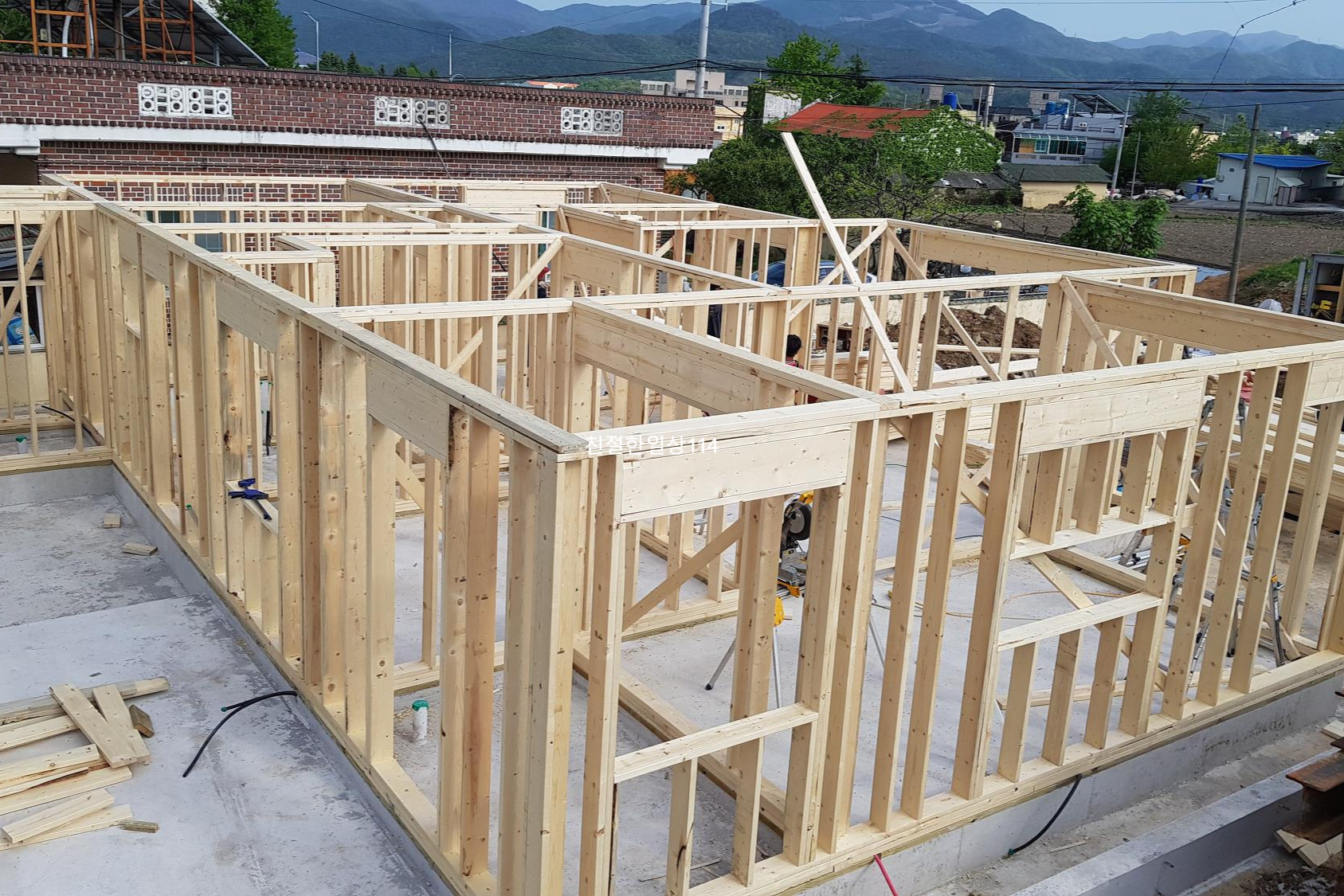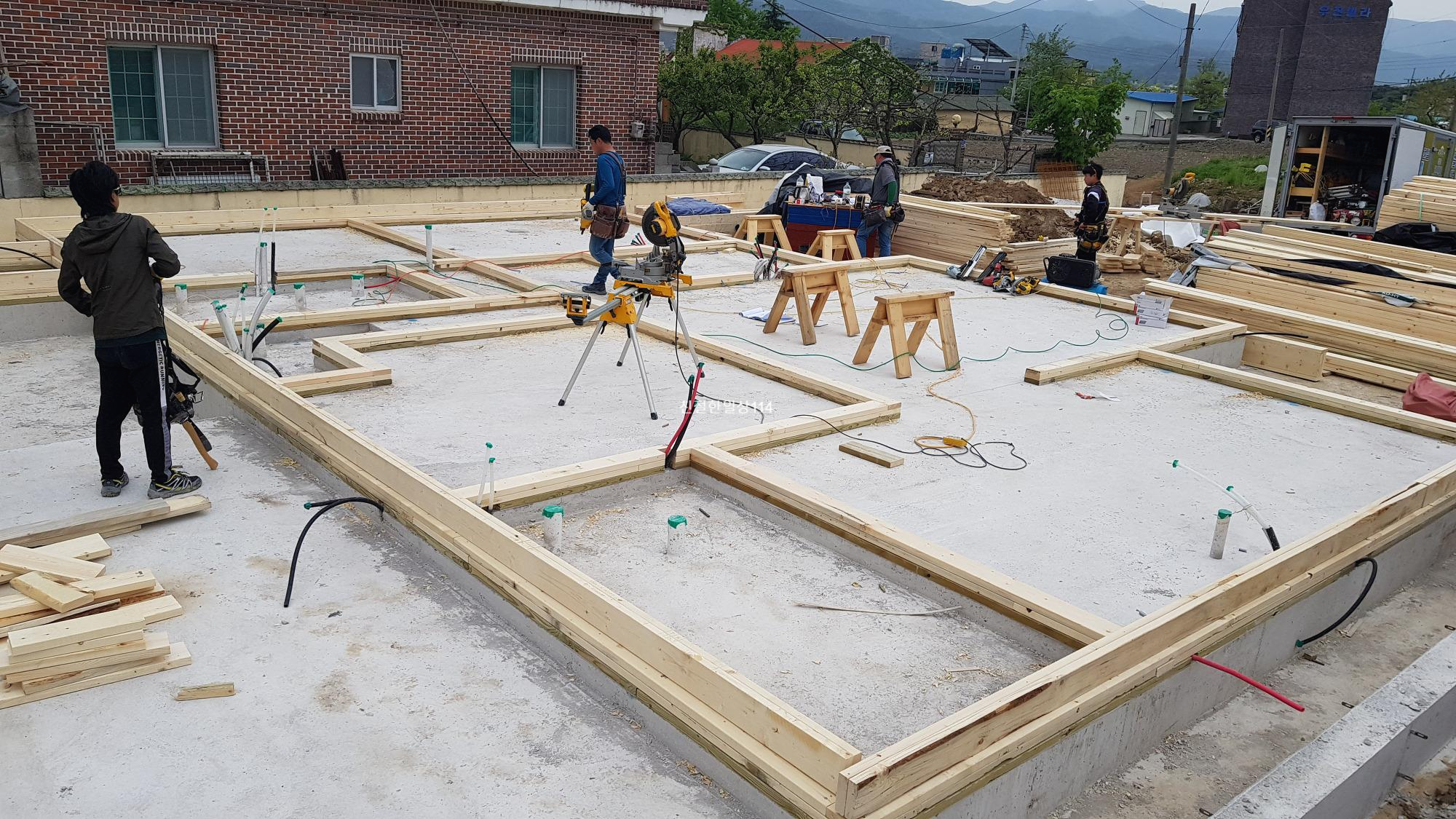 토대가 다 돼 갈때쯤 토대위에 벽체의 스터드와 창호, 문 등이 들어설 자리를 표시하게 된다.