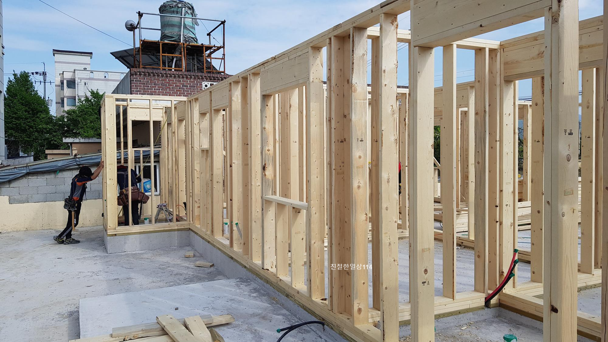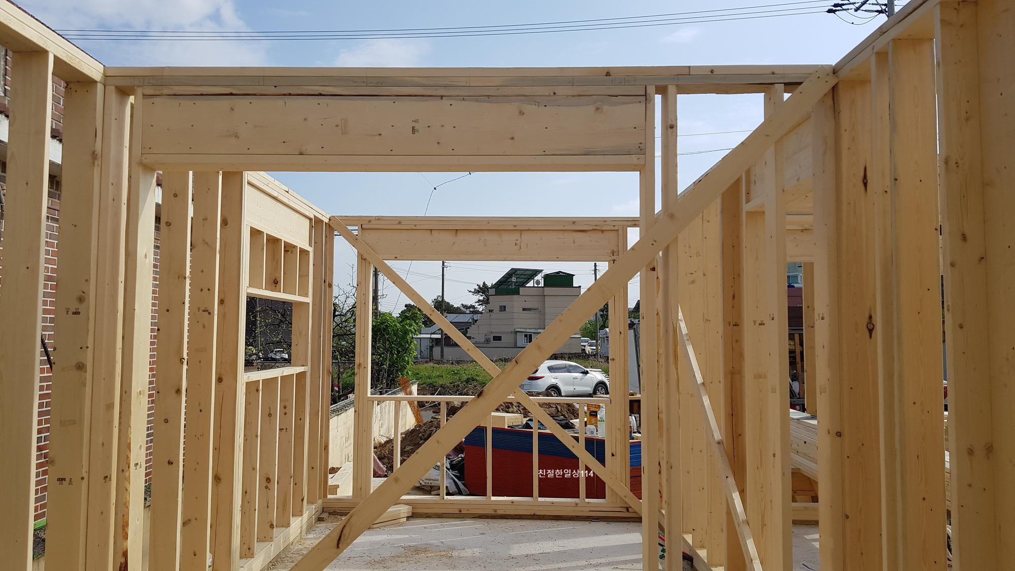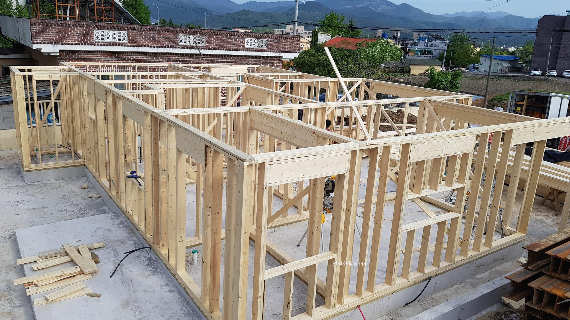 토대위에 스터드로 기둥을 세운다. 문과 창호를 낼 곳은 치수를 재어 재단해서 시공한다.