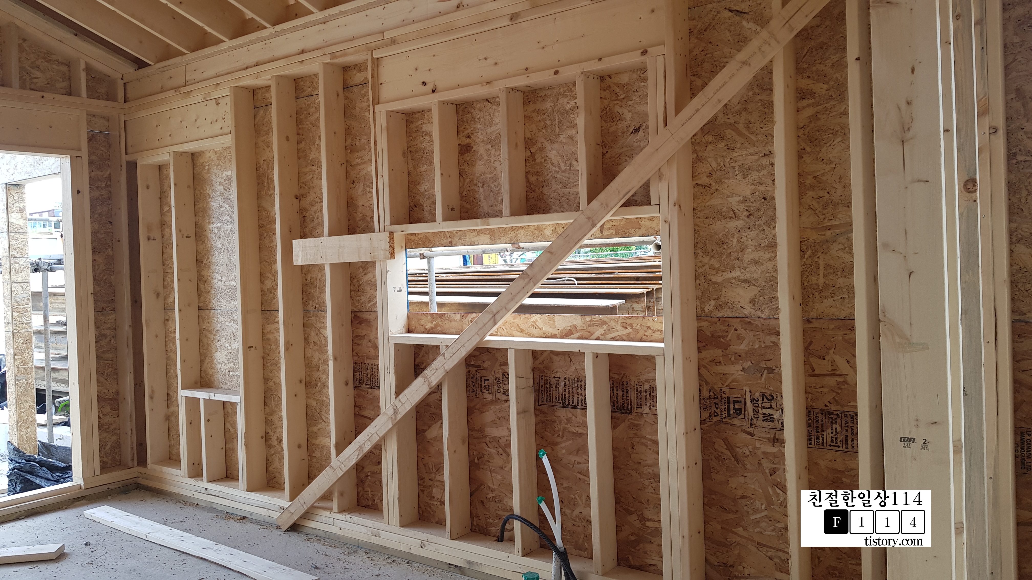 골조의 뼈대인 스터드가 마무리 되면 외벽쪽으로 합판을 붙인다.