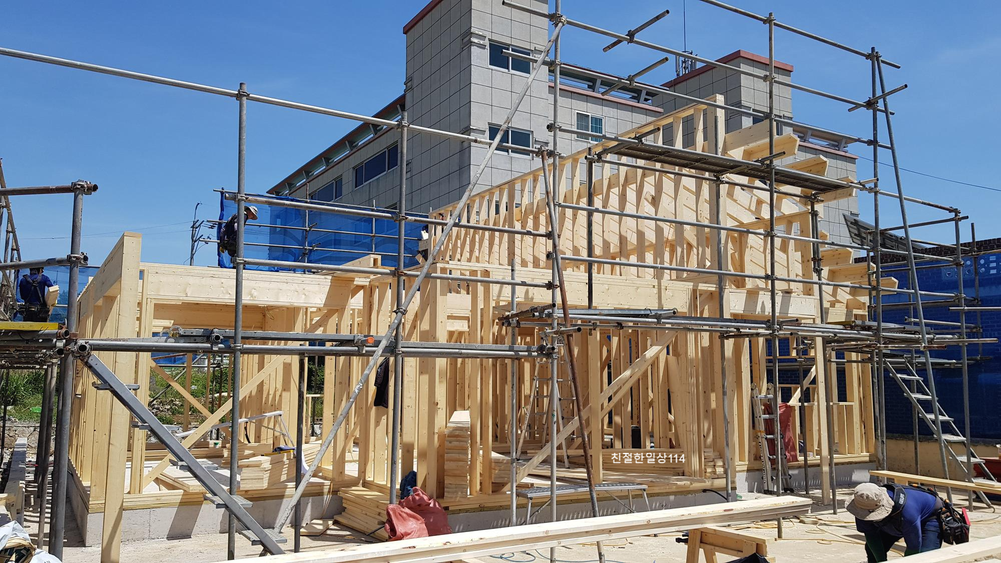1층의 골조가 거의 끝나갈 무렵 외부 강관비계를 설치한다. 비계는 2층과 지붕 시공시 작업자의 안전을 위해서 비계 전문 업체에서 설치를 한다. 이때 동쪽으로 비계를 설치할 공간이 협소해서 미리 이웃집에 양해를 구하였다. 이웃집에 토지 매입때부터 인사를 드리고 시공에 앞서 공사일정과 기간을 설명드려서 인지 흔쾌히 이해해주었고 안전하게 비계를 설치할 수 있었다.