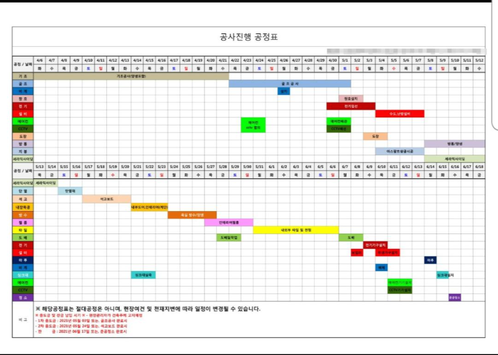 그렇게 기반시설을 깔고 기초공사와 더불어 배수로와 옹벽공사를 함께 진행했다. 기초공사를 하는 도중 시공사에서 담당자가 바뀌어 과장님과 앞으로 공사를 진행하게 되었다. 40전후로 보이는 과장은 목소리에 힘이 있었고 젊기에 소통이 좀더 잘 될 것 같다는 생각이 들어 담당자 변경에 대해서 나쁘게 생각지는 않았다. 과장이 시공 예사일정을 보기 쉽도록 타임스케줄을 짜서 보내주었다. 목조주택 시공은 2 ~ 3개월 정도가 걸린다. 계약서상에 3개월 이내 완공이라고 명시되어 있있는 것만 봐도 늦어도 3개월이면 모든 공정이 끝나는 것 같다. 이 공정 스케줄 표는 받은 날부터 공사를 진행하는 내내 많이 보게 되고 활용하며 참 요긴하게 써먹었다. 시공 예상 일정이 있으니 보기 좋은 것도 있지만 건축주가 챙겨야할 것들을 언제 어느 공정에 맞춰줘야 하는지도 알 수 있어 시공이 원만하고 시간낭비 없이 진행 될 수 있게 하는데 많은 도움이 되었다.  시공을 진행할 때 시공사에서 먼저 제작하여 줄 수도 있겠지만 아니라고 하면 요청하여 받아 두도록 하는 것이 좋겠다.