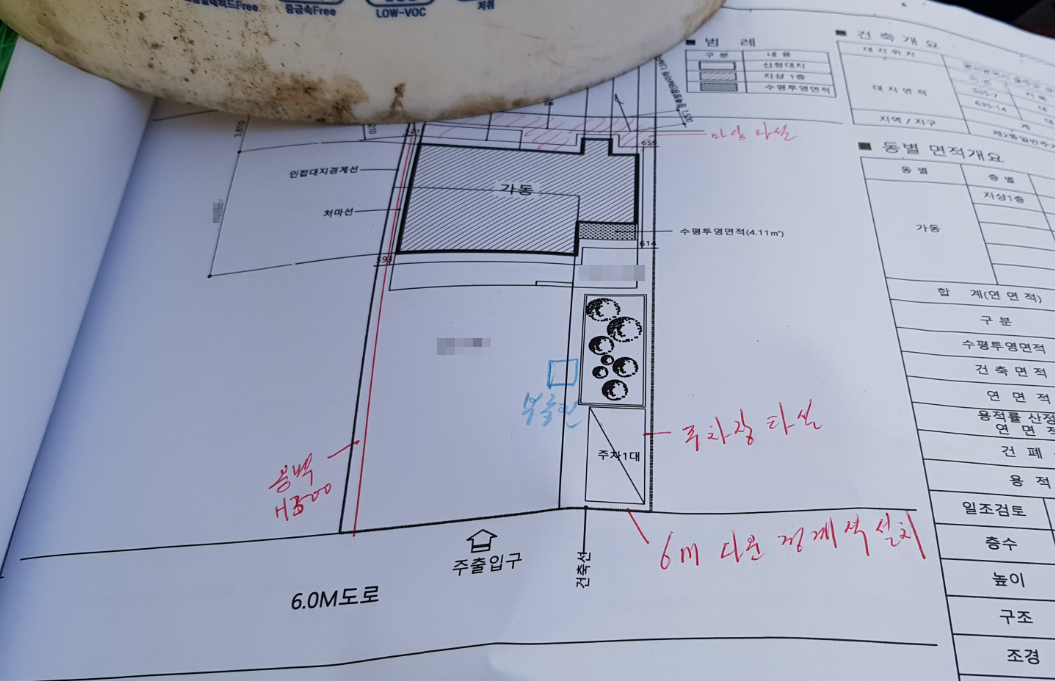 토지가 전체적으로 경사져 있어 비가 올 때 옆땅에서 흘러들어오는 빗물을 막아줄 옹벽과 배수로 작업을 해야한다고 한다. 거기에 주차장이 1개 필수로 들어가야해서 추가 공사 견적을 받아보니 510만원이 나왔다.