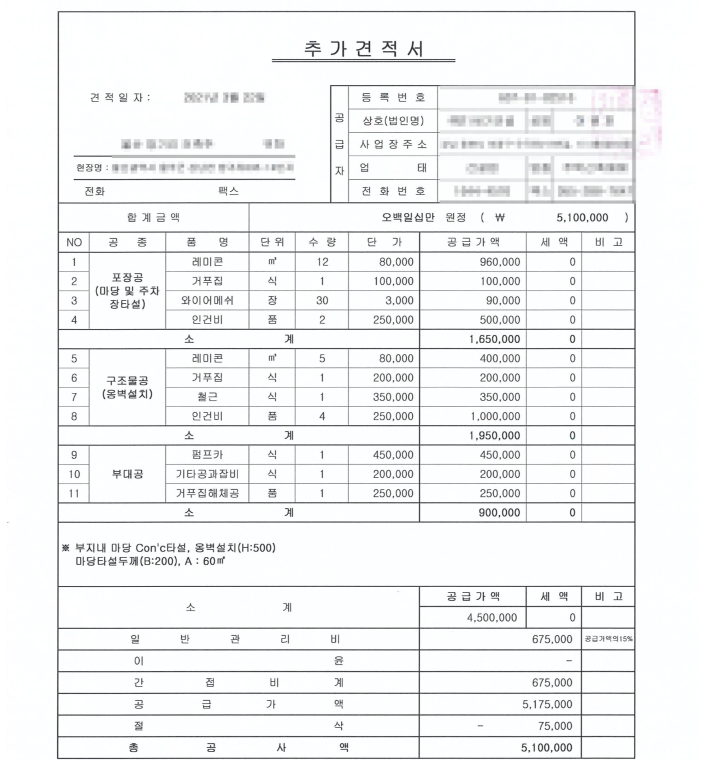 ㅣ공사에 앞서 땅을 살펴보며 나온 추가공사비 510만원
