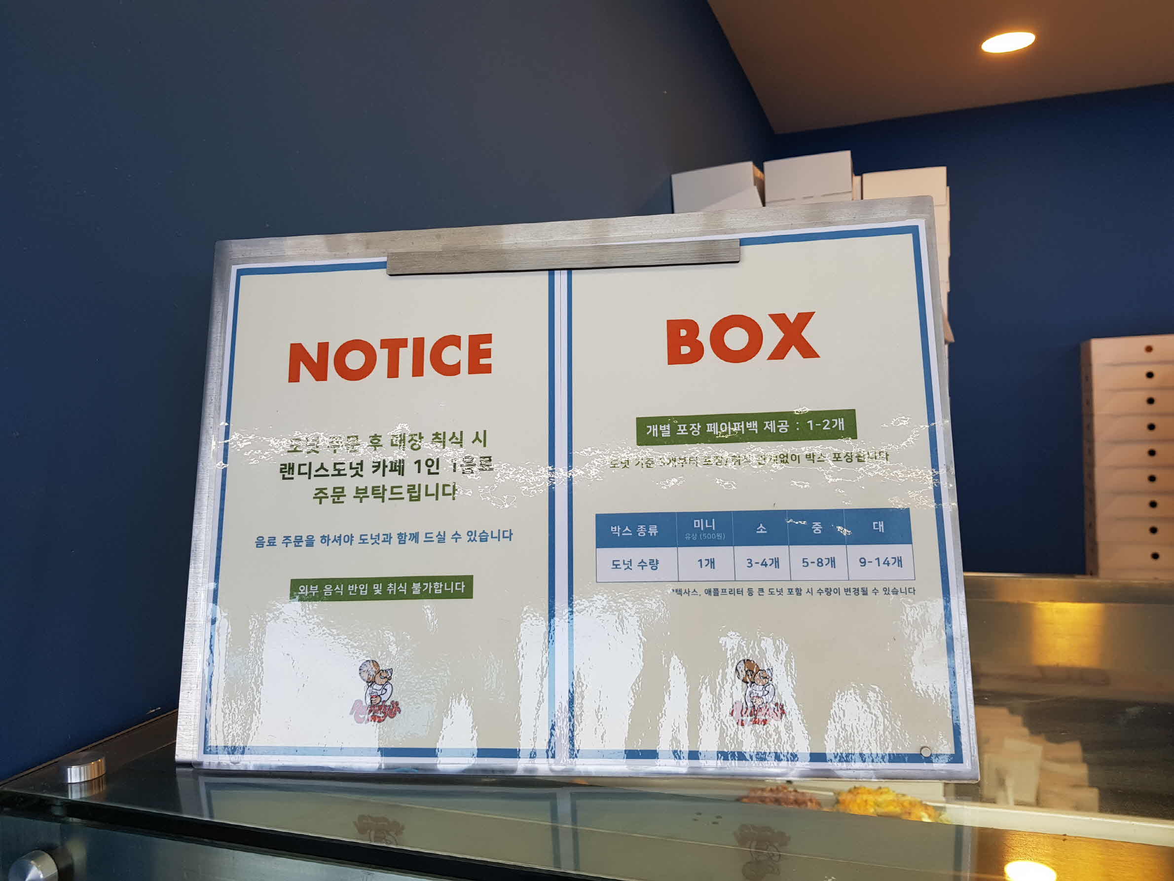 랜디스 도넛 매장에서는 포장과 매장에서 먹고 가는 것 모두 가능하다. 매정에서 먹고 갈 경우에는 카페를 1인당 1 음료는 주문해야 한다.