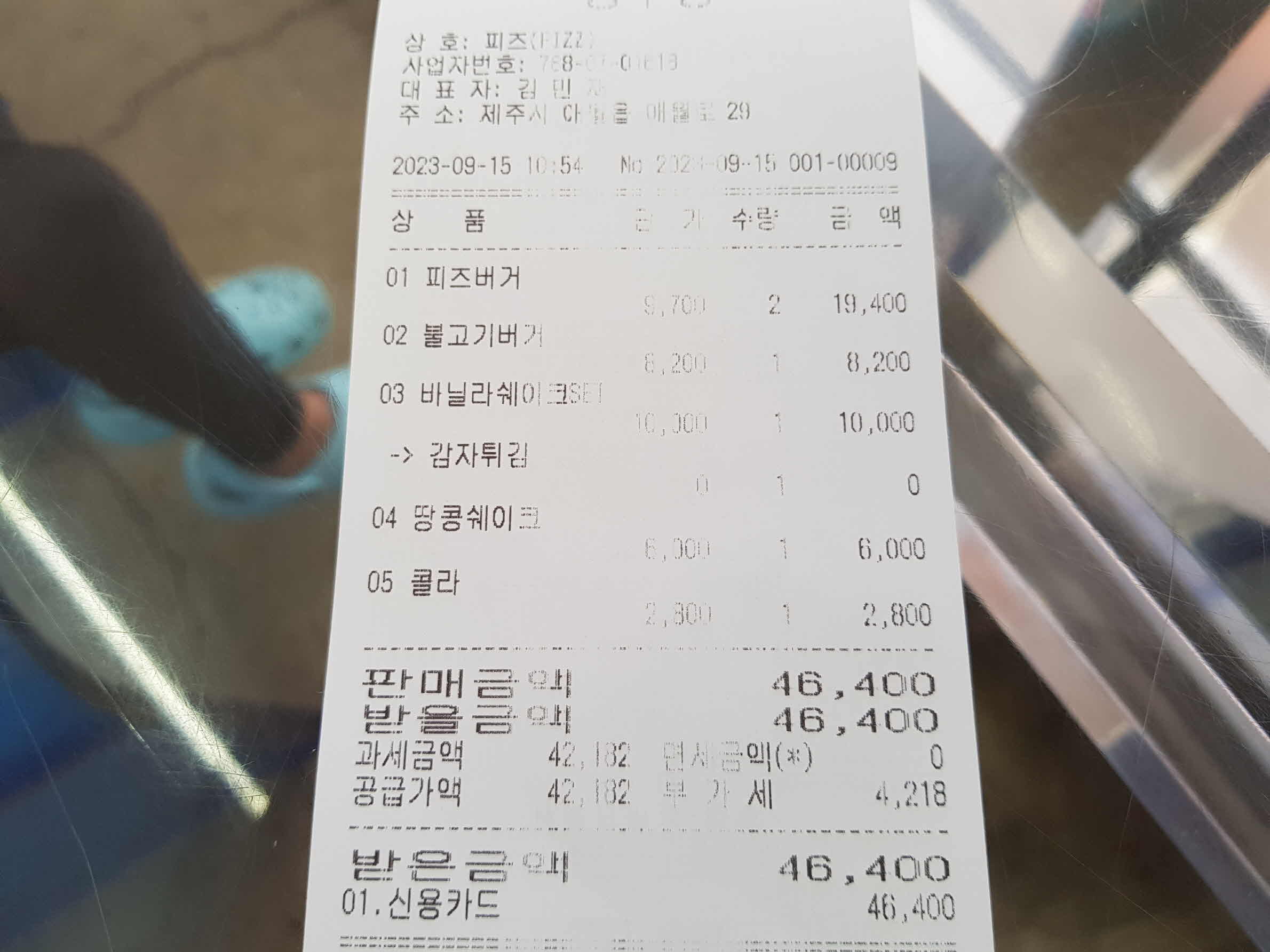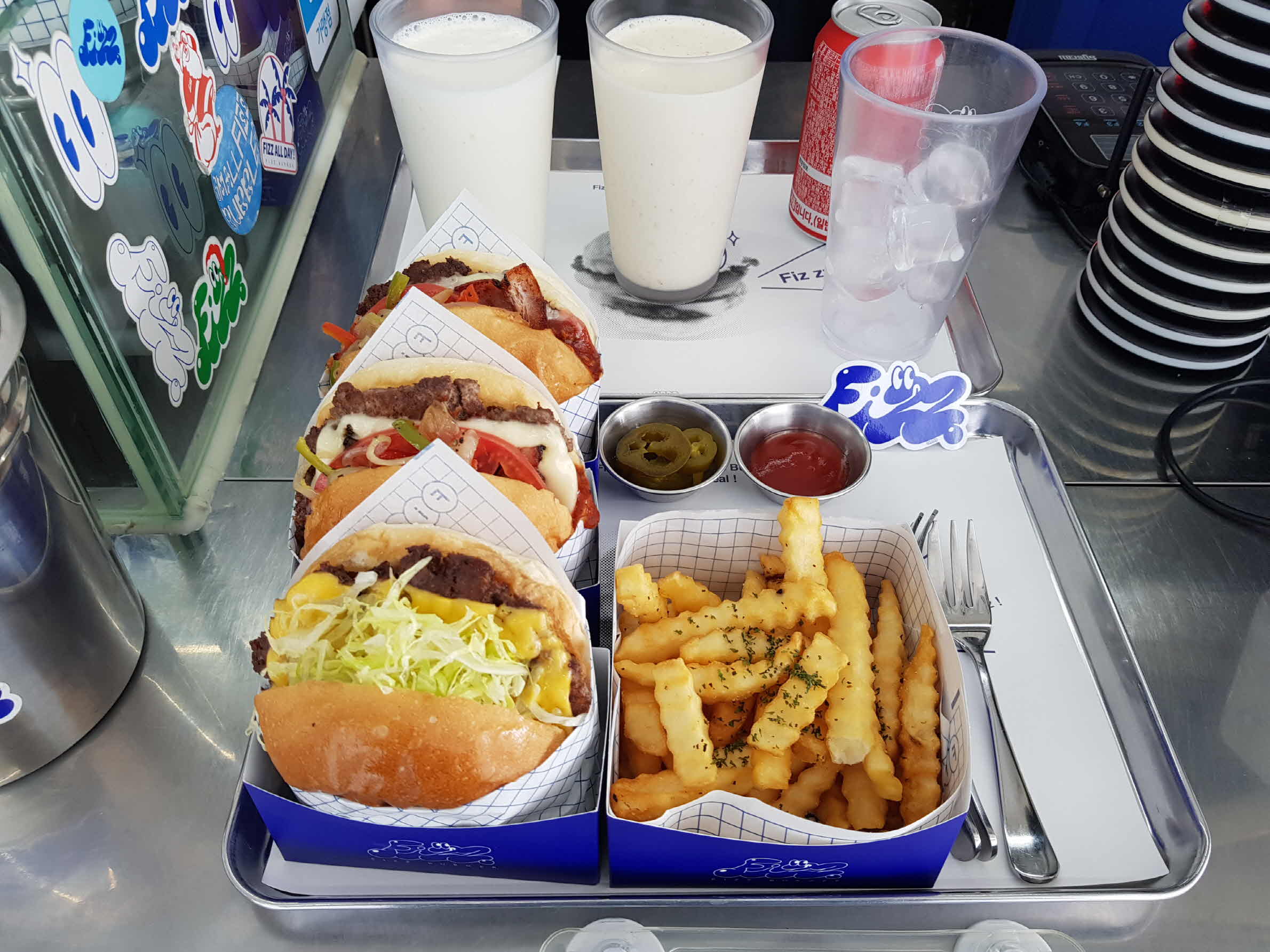 피즈버거 2개, 불고기 버거 1개, 바닐라 쉐이크 세트, 땅콩 쉐이크, 콜라로 했다. 총금액은 46,400 원이 나왔다. 햄버거 가격치고는 비싼 편이지만 그래도 수제 햄버거이고 고기가 많이 들어있다고 하니 (두툼한 패티!) 적정한 가격이라 생각키로 한다.