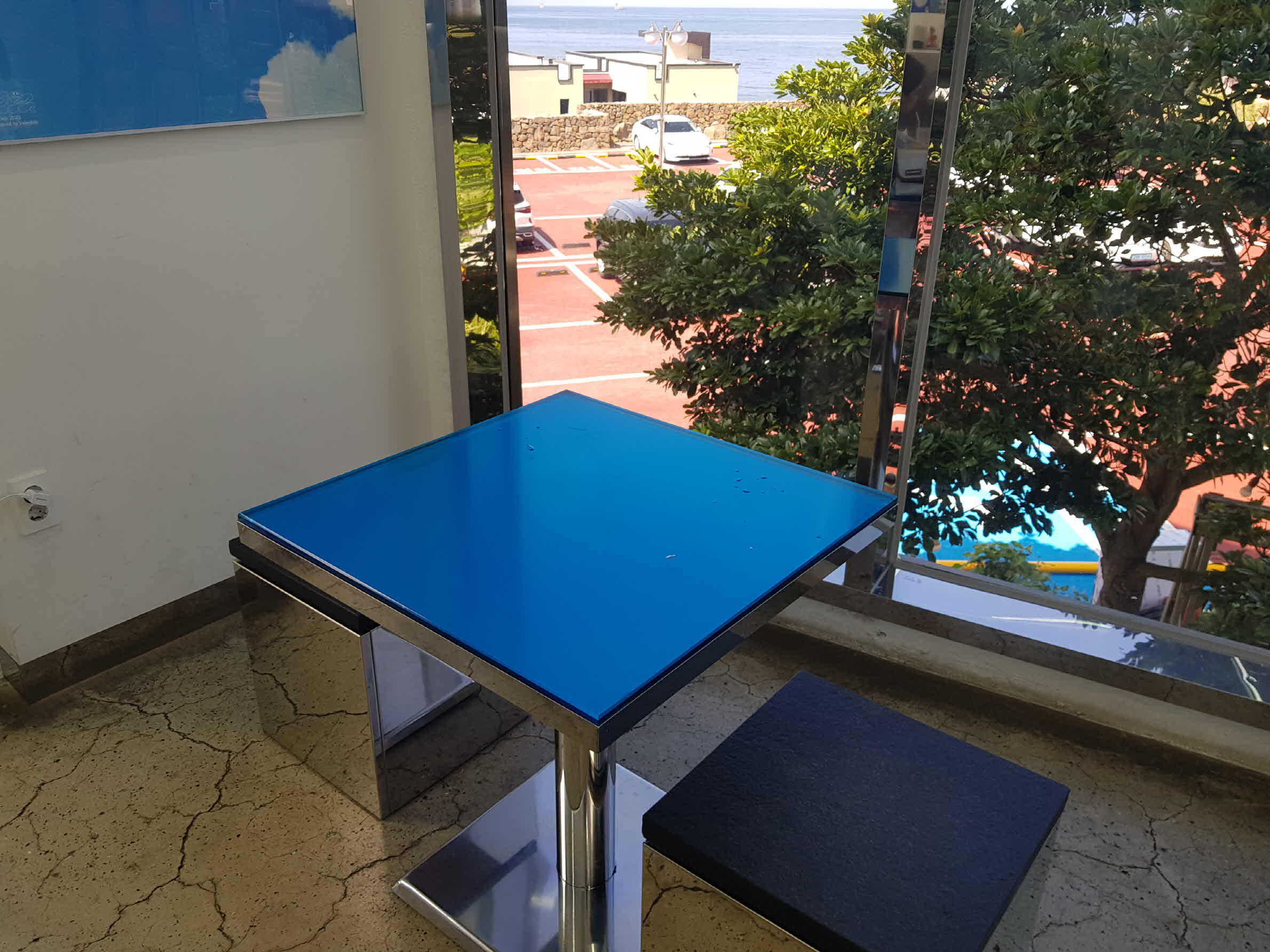 창가 쪽에 있는 테이블. 창가쪽에는 바다를 볼 수 있기에 인기가 많다. 사람이 많지 않아 창가쪽에 자리에 앉아 기다리기로 한다.