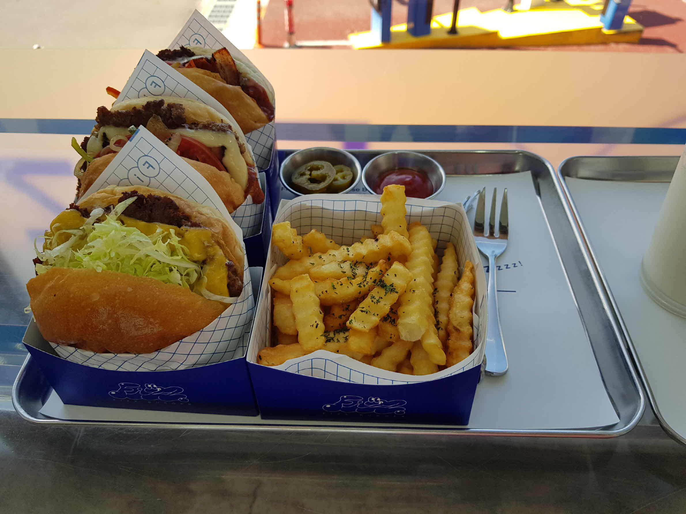 주문한 음식이 다 됐다는 벨이 울리고, 버거를 찾으러 간다.