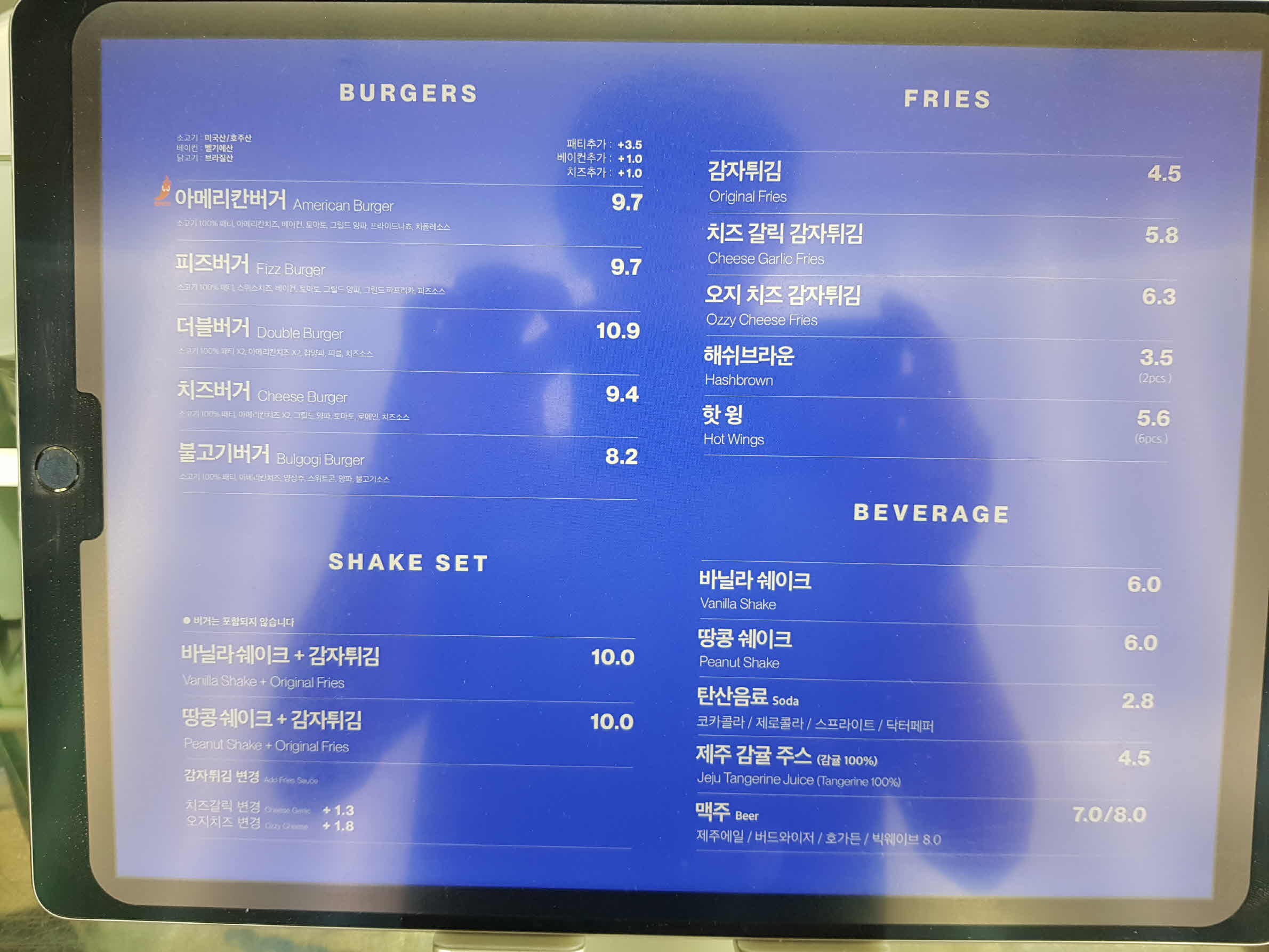 메뉴로는 아메리칸버거 9,700 원 / 피즈버거 9,700 원 / 땅콩 쉐이크 + 감자튀김 10,000 원 / 땅콩 쉐이크 6,000원 등이 있다. 다른 메뉴도 있으니 자세한 건 위 메뉴판을 참고하자.