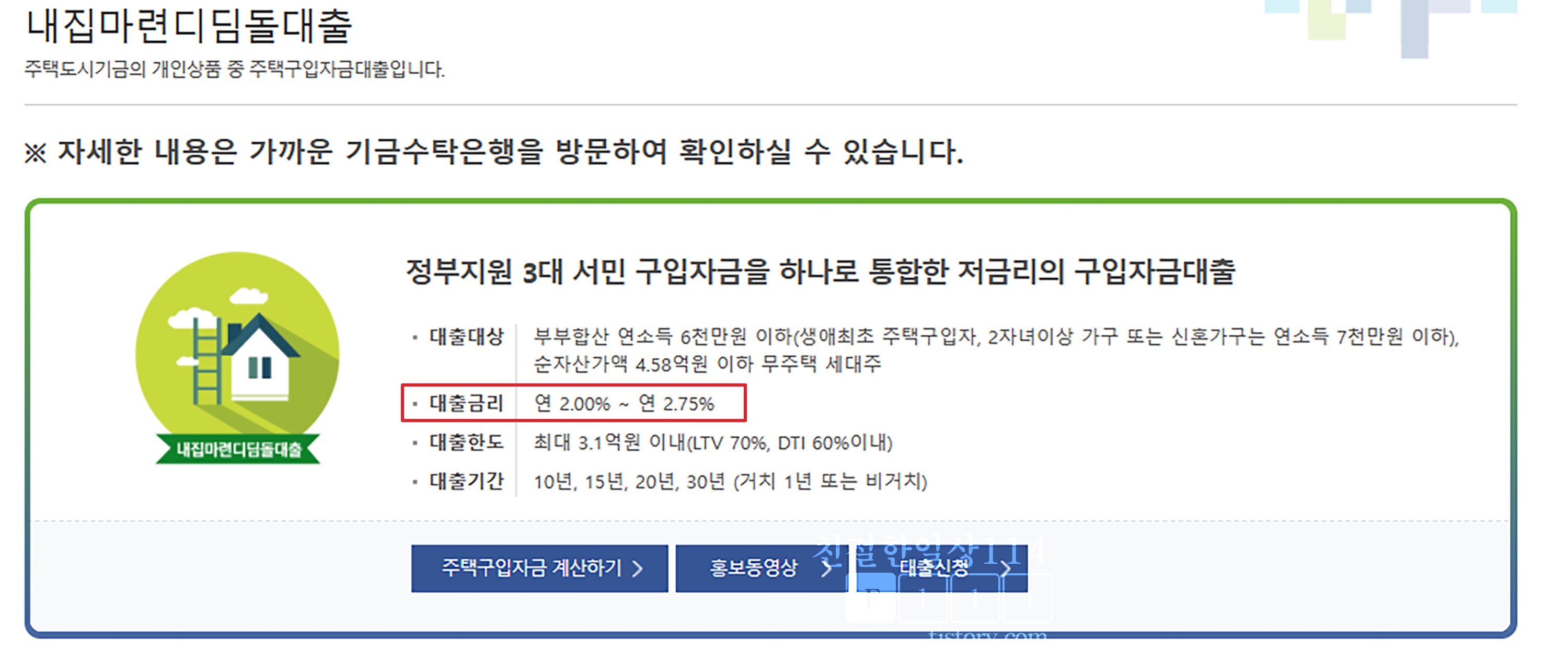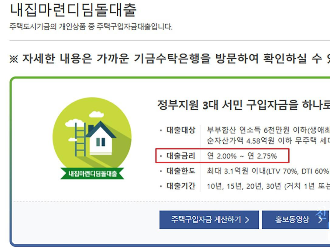 주택도시기금 주택담보대출 - 내집마련디딤돌대출 (정부지원 3대 서민 구입자금 통합 저금리 대출 / 대출금리 연 2% ~ 연 2.75%)
