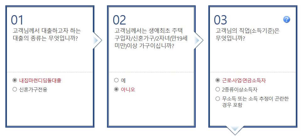 * 7가지 항목에서 빨간색으로 표기를 해둔 항목은 전부 '예' 라는 조건이 되어야 주택도시기금 내집마련디딤돌대출 상품 대상이 되며 대출신청이 가능하다.