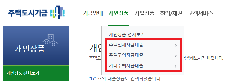 한국주택금융공사에서 제공하는 주택금융 상품: 전세자금보증(대출아님), 보금자리론(주택구입자금대출), 주택연금 등