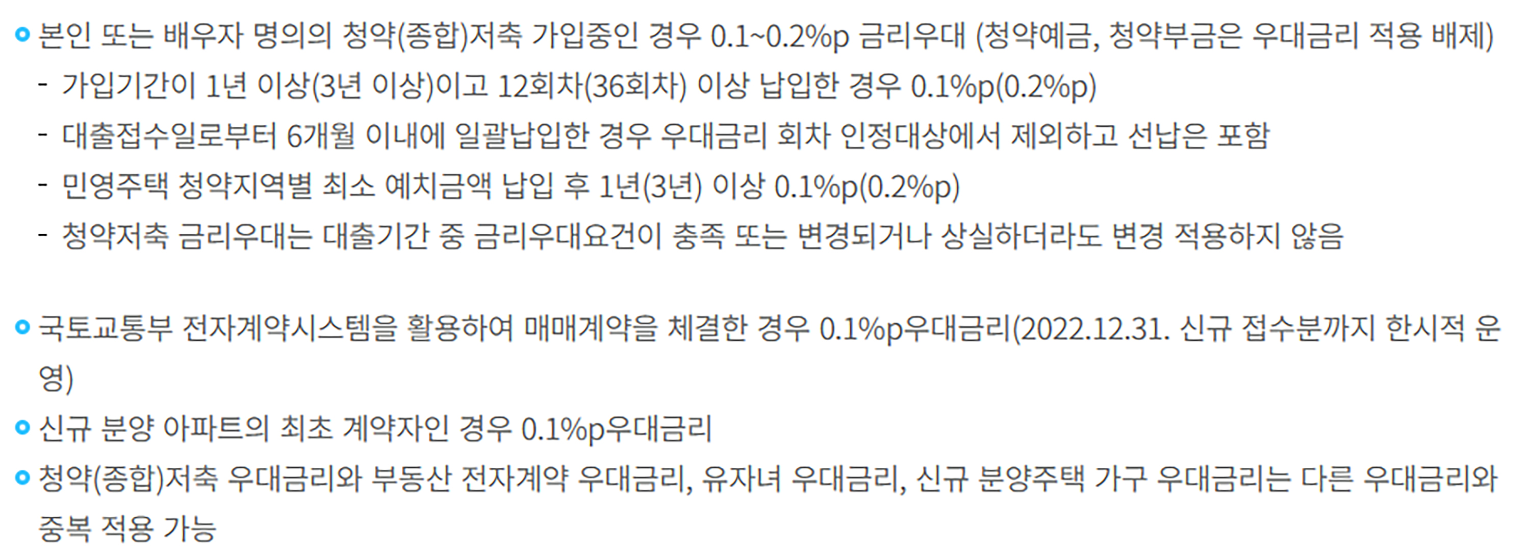 청약통장은 가입기간에 따라서 0.1% ~ 0.2% 우대금리를 받을 수 있으며 전자계약시시템을 활용하여 매매계약을 체결한 경우에도 0.1%의 우대금리를 받을 수가 있다.