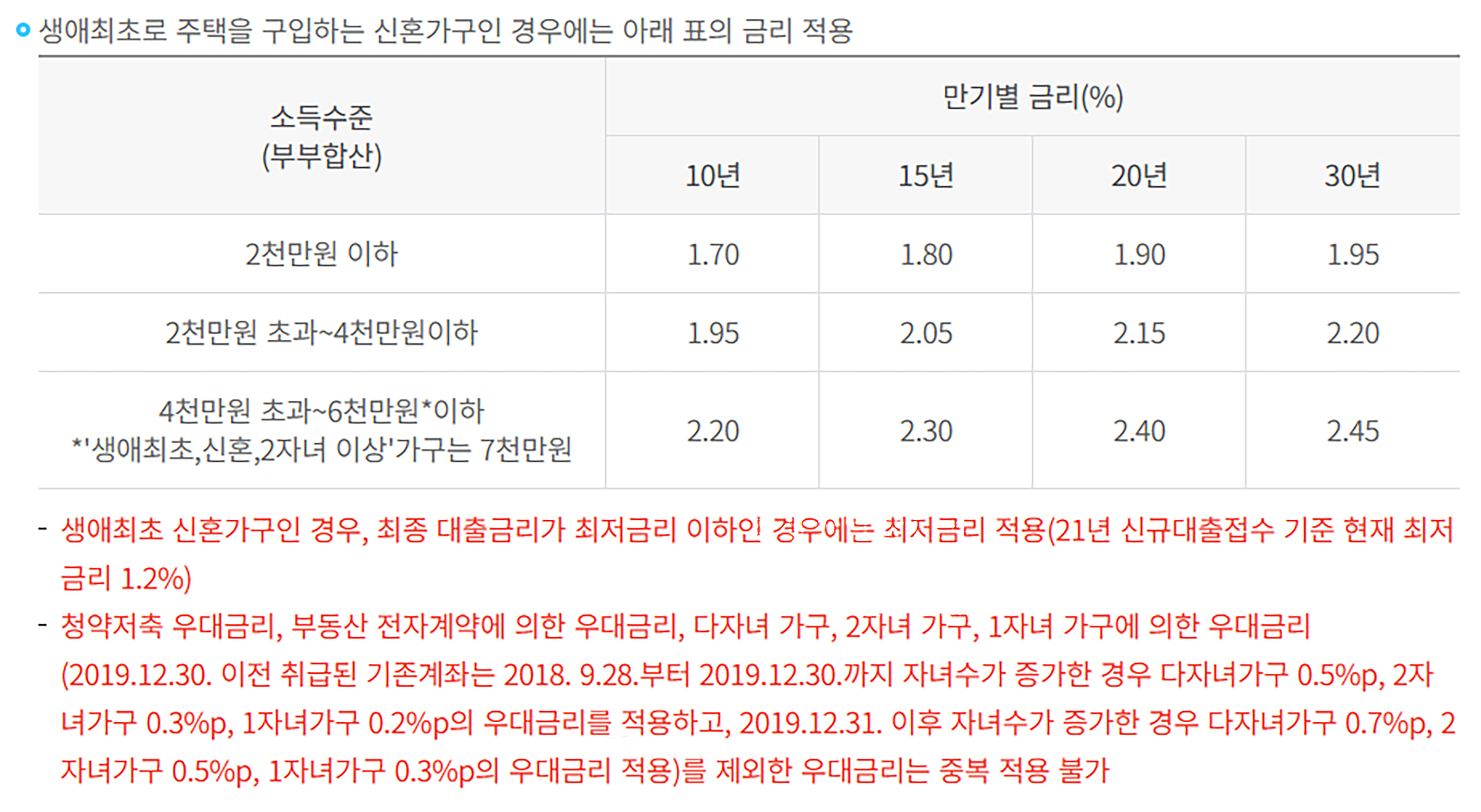* 부부합산 연소득이 7천만원 이하이며 대출기간을 20년으로 받는다고 가정할때 2.4%의 이자에서 2020년 이후 1자녀를 낳았다고 한다면 0.3% 우대금리를 받아 2.1%의 금리가 적용된다.