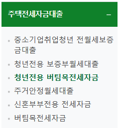 주택도시기금에서 제공하는 주택금융 상품: 주택구입자금대출 (신혼부부전용/신혼희망타운전용/디딤돌대출/모기지/오피스텔구입자금), 전세월세자금대출(중소기업취업청년/청년전용/버팀목전세자금/신혼부부전용/주거안정월세대출) 등