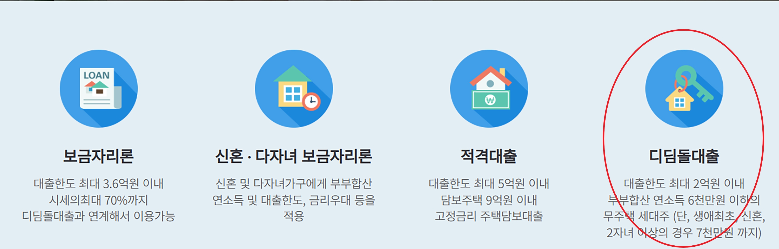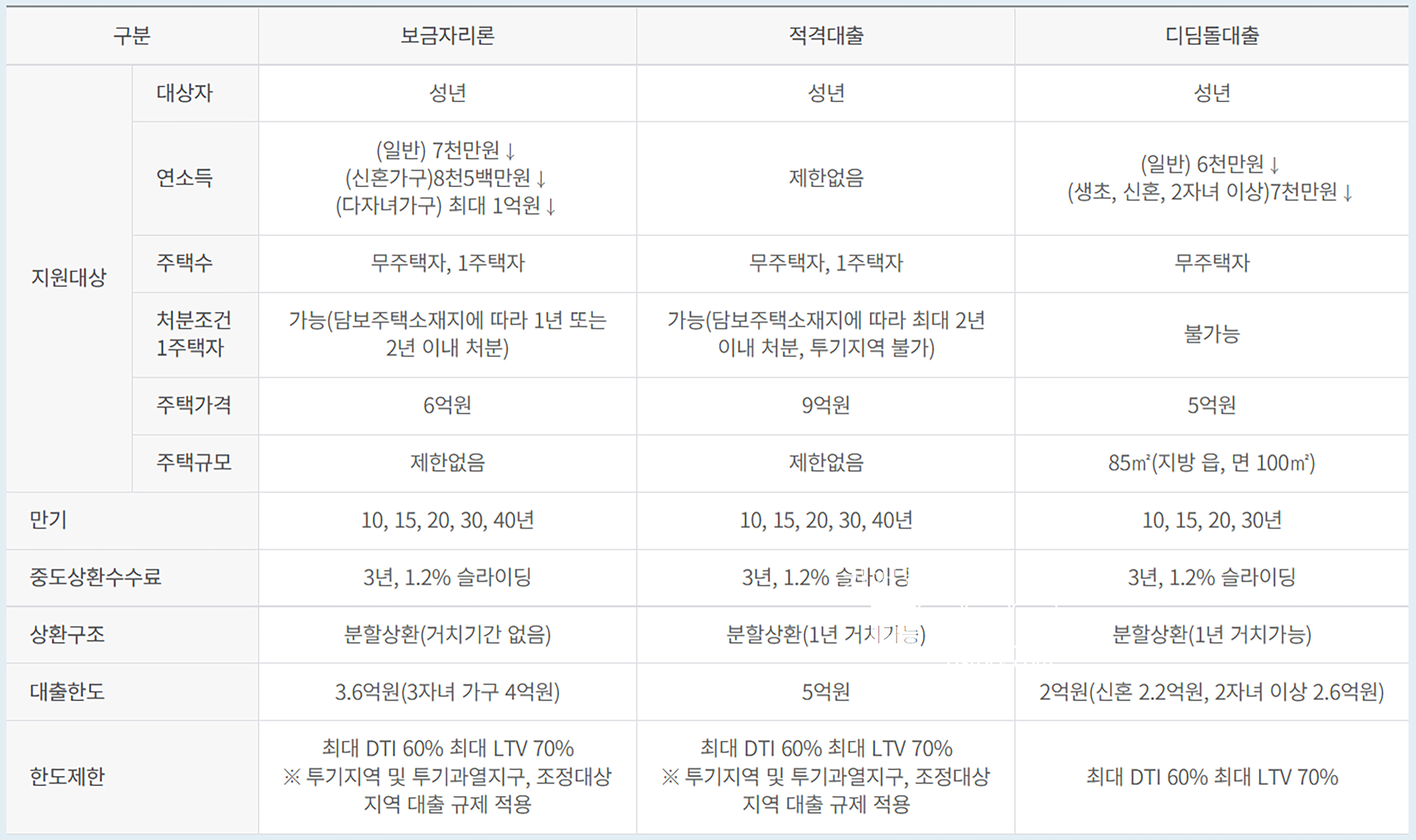 대출한도: 적격대출 > 보금자리론 > 디딤돌