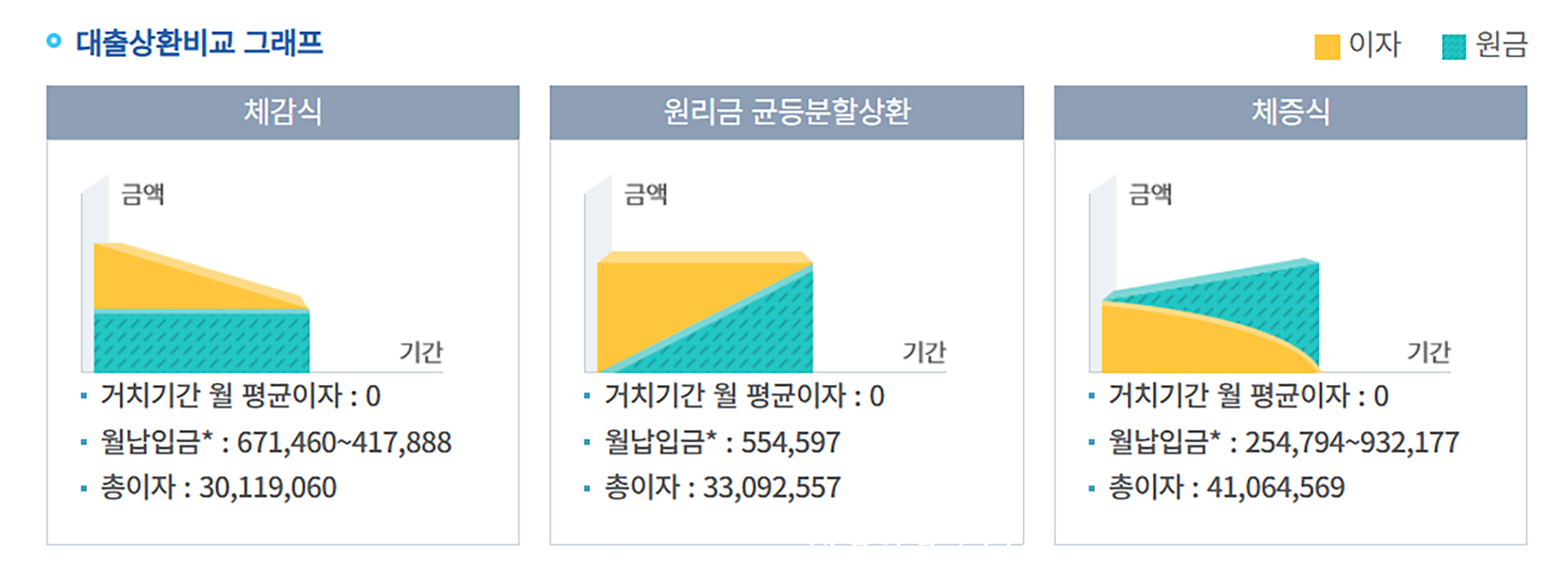 좀 더 아래에 내려보면 3가지 상환방식에 따른 월납입금과 총이자를 한눈에 볼 수 있도록 표로 제시된다.