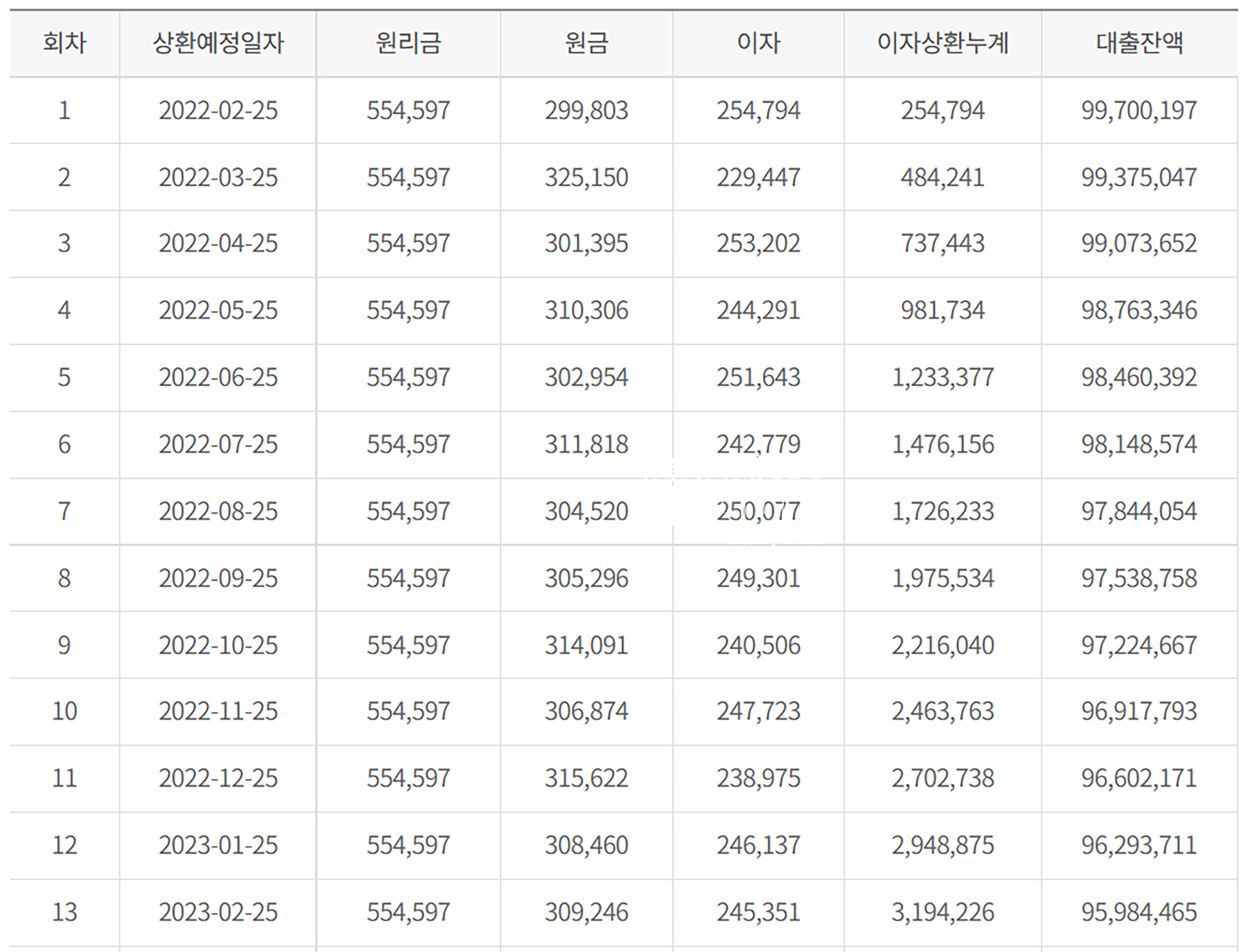 1억원을 이자율 3%로 받은 대출을 원리금균등상환 방식으로 갚아나가면 매달 554,597원이 20년(240개월) 동안 내게 된다.