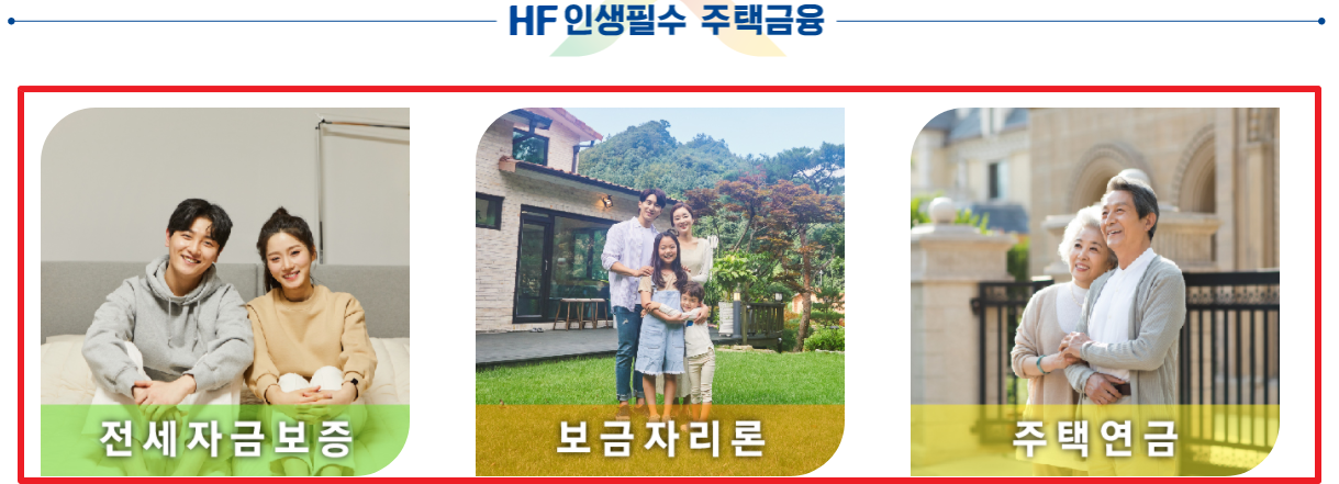 한국주택금융공사에서 제공하는 주택금융 상품: 전세자금보증(대출아님), 보금자리론(주택구입자금대출), 주택연금 등