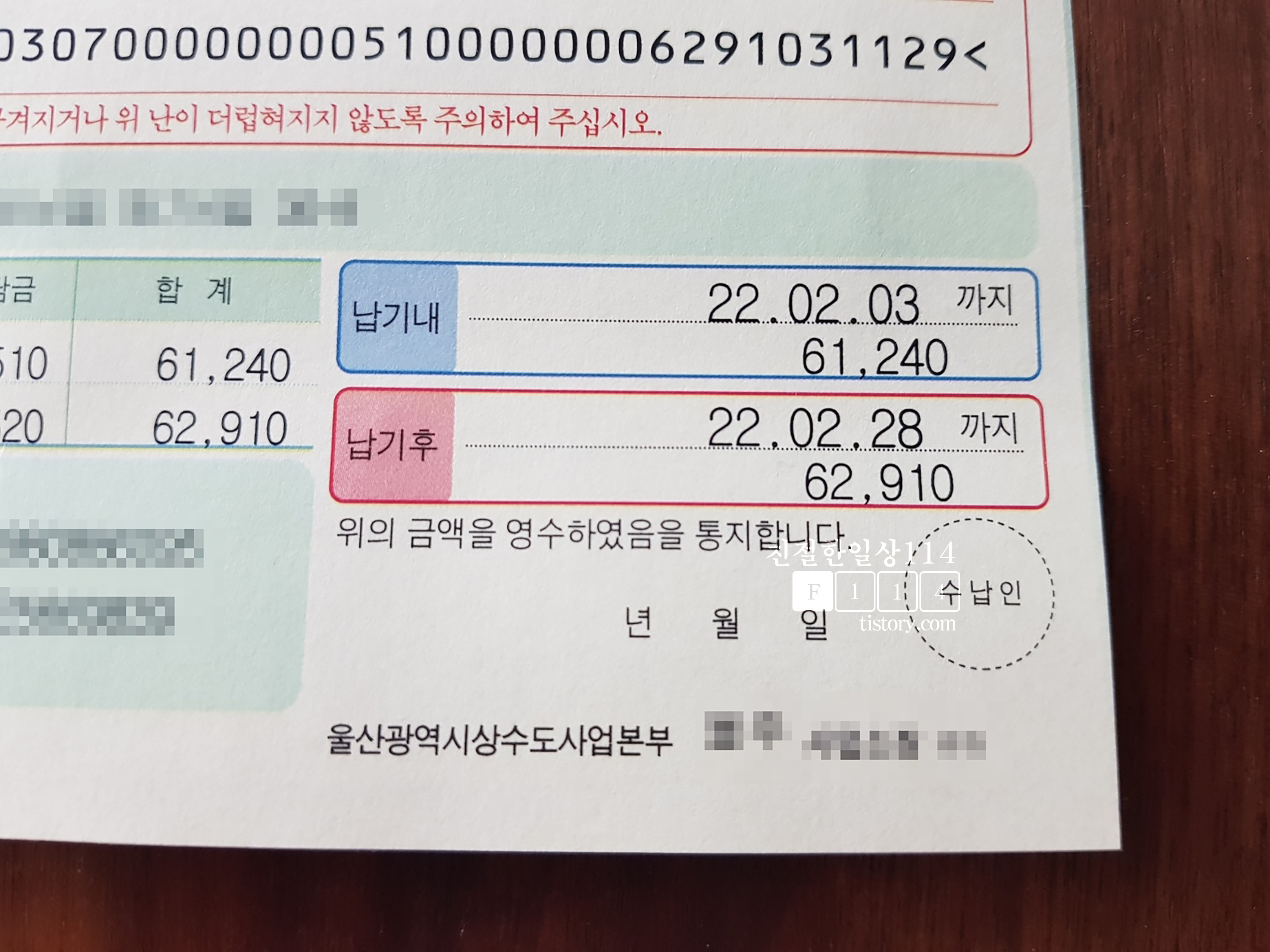 가장 최근에 받은 수도요금 고지서상 요금은 납기내 61,240원이다. 납기일이 지나고 나서는 3%의 연체료가 부과되어 62,910원이 된다. 세금은 무조건 기간안에 내는 것이 유리하다. 이제 이 납기내 요금으로 계산을 해본다.