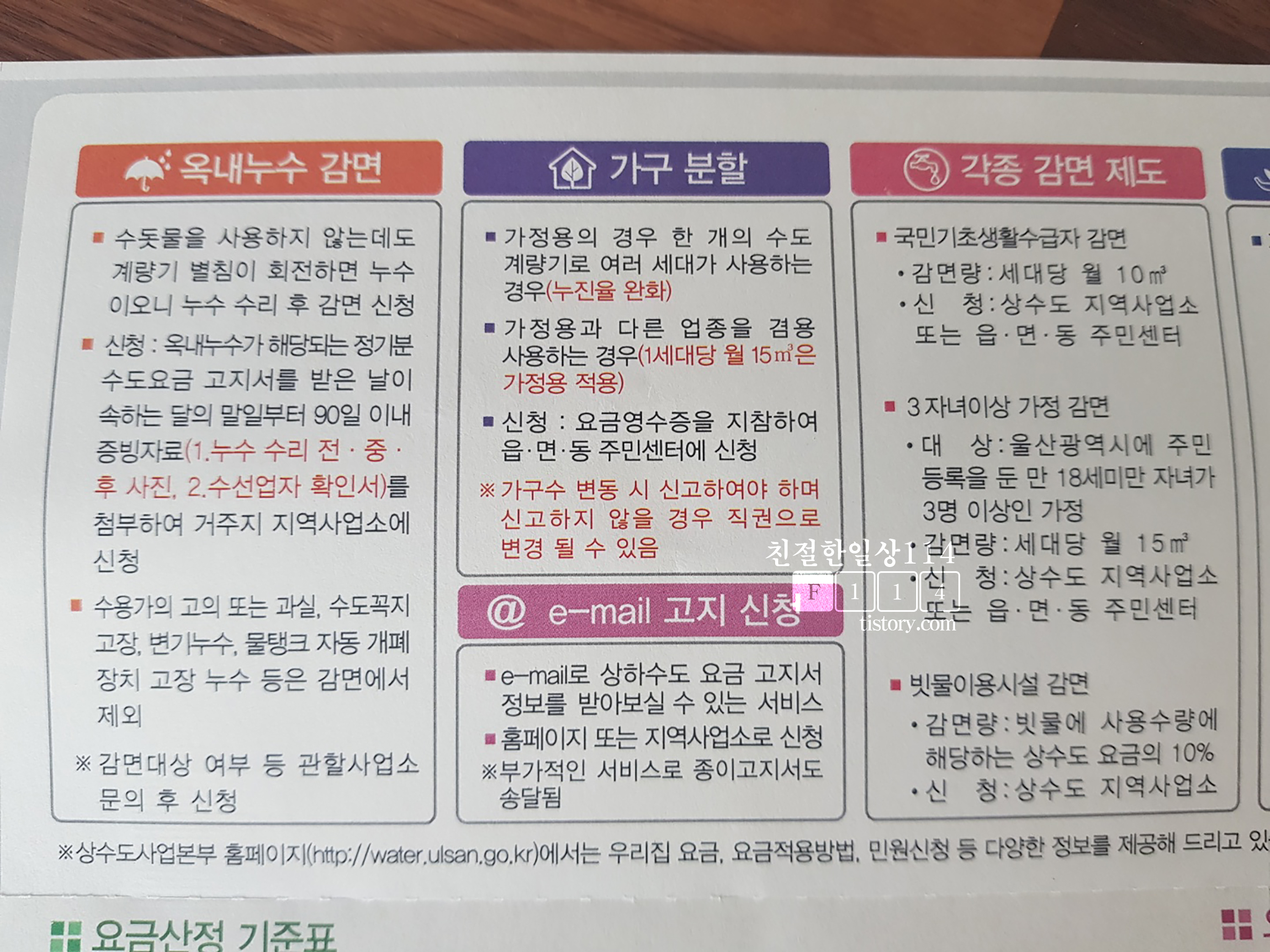 수도요금 납부고지서를 배달해주시는 분이 물 사용량이 전월보다 많아졌다며 누수가 없는지 확인해보라는 말씀을 주셨다. 그래서 필자도 요금을 자세히 보고 계산해보기에 이르렀는데 납부고지서 뒷장에 보니 누수에 따른 감면(할인)이 있다. 납부고지서상에 기재되어있는 수도요금 감면/할인제도에 대한 내용을 남겨본다.